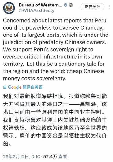 法新社2月12日消息:美国国务院西半球事务办公室在社交媒体上表示,“秘鲁可能无法对其最重要的港口之一钱凯港(Chancay)行使控制权,该港口由掠夺性的中国业主管辖”。这个办公室补充道:“这应成为对该地区乃至全世界的警示:廉价的中国资金要以主权为代价”。 这话听起来冠冕堂皇,好像美国是在关心秘鲁的主权,怕秘鲁吃亏似的,但明眼人一看就知道,美国根本不是好心,纯属没事找事、故意抹黑中国,更暴露了它想插手拉美事务、搞霸权的真实心思。 钱凯港是秘鲁的港口,主权从头到尾都属于秘鲁,这是毫无疑问的。中国企业和秘鲁是正常的商业合作,不是美国说的“掠夺性管辖”。 钱凯港是中国“一带一路”倡议中的一个合作项目,由中国企业承建和运营,整个过程都严格遵守秘鲁的法律,服从秘鲁政府的监管,秘鲁政府随时能对港口行使控制权,根本不存在美国说的“管不了”的情况。 咱们再说说,中国企业管钱凯港,到底给秘鲁带来了什么好处,而不是美国嘴里的“掠夺”。根据公开的真实数据,钱凯港开港一年来,成绩特别亮眼,给秘鲁带来了实实在在的好处。 以前秘鲁没有能停靠超大型集装箱船舶的港口,钱凯港建成后,彻底改变了这个局面,还把秘鲁到中国的海运时间缩短到23天,节约了20%以上的物流成本,不管是秘鲁的货物出口到中国,还是中国的货物运到秘鲁,都方便多了,也便宜多了。 除此之外,钱凯港还带动了秘鲁的经济发展,创造了大量的就业岗位和税收。开港一年,钱凯港的集装箱吞吐量就超过27万标箱,散杂货运了136.68万吨,进出口贸易总额加起来有十几亿美元,给秘鲁累计创造了6.97亿秘鲁索尔的税收,这些钱都能用来改善秘鲁老百姓的生活,比如建学校、修公路、搞卫生健康项目。 同时,港口建设和运营期间,给当地带来了超过3000个固定工作岗位,还开展了45000学时的技能培训,帮当地工人学会了技术,以后不管在哪都能找到好工作。 另外,钱凯港还带动了当地旅游业的发展,旅游业增长了30%到40%,餐饮、服务等行业也跟着兴旺起来,当地老百姓的收入也增加了不少。 美国说“中国资金要以主权为代价”,更是无稽之谈。中国给秘鲁的资金,不是什么“廉价陷阱”,而是正常的投资合作,目的是帮助秘鲁建设基础设施,带动当地发展,从来没有要求秘鲁放弃主权,也没有干涉秘鲁的内政。 相反,中国企业还主动帮秘鲁修缮社区道路、修复危房、重修幼儿园,创办学校培养当地人才,实实在在为当地老百姓着想,这怎么能叫“掠夺”呢? 其实,美国之所以这么造谣,根本不是关心秘鲁的主权和发展,而是有自己的坏心思,这也清晰地能看出来,美国现在正转向更激进、更具排他性的干预主义立场,而且把这种坏策略,用到了整个拉丁美洲。 大家都知道,长期以来,美国一直把拉丁美洲当成自己的“后花园”,不允许其他国家和拉美国家走得太近,更不允许其他国家在拉美地区有影响力,生怕抢了它的利益、动摇它的霸权地位。 这些年,美国在拉丁美洲的干预行为,从来就没停止过,而且越来越激进。就拿最近来说,2026年1月,美国以“打击贩毒”为由,出动军队空袭委内瑞拉,还强行控制了委内瑞拉的总统,把人带到了美国,这就是赤裸裸的军事干预,严重侵犯了委内瑞拉的主权。 再比如,之前美国还策动军事政变,推翻了危地马拉的政府,就因为那个政府的土地改革,损害了美国企业的利益,导致危地马拉陷入了长期的内战,老百姓流离失所。 还有前不久,美国还在巴拿马搞小动作,让当地法院判决中企运营的两座港口“合同违宪”,然后派其他公司接管,目的就是削弱中国在拉美的影响力。 这次美国针对秘鲁钱凯港造谣,就是它干预拉美事务的又一个小动作。因为中国和秘鲁的钱凯港合作太成功了,不仅带动了秘鲁的发展,也让中国和拉美国家的合作越来越紧密,这让美国坐不住了、急眼了。 它见不得中国好,见不得拉美国家和中国合作共赢,就想出了造谣抹黑的办法,想搅黄中国和秘鲁的合作,阻止中国在拉美地区的发展,同时也警告其他拉美国家,不准和中国走得太近,不然就会被它打压。 美国的心思,其实很多拉美国家都看得清清楚楚。秘鲁政府虽然内部有一些小分歧,但也知道钱凯港的合作给自己国家带来了巨大好处,不会轻易被美国的谣言迷惑。 而且,中国和拉美国家的合作,一直都是互利共赢的,中国不搞霸权、不搞掠夺,只是真心实意地帮助拉美国家发展,和美国的霸权主义、干预主义完全不一样。 美国这种激进的干预主义做法,不仅会破坏中国和拉美国家的合作,还会扰乱拉丁美洲的稳定和发展,最终损害的还是拉美国家老百姓的利益。 这些年,美国在拉美搞的各种干预,导致很多国家陷入动荡和贫困,老百姓生活苦不堪言,而中国的投资合作,却给拉美国家带来了发展的机遇和希望,两者一对比,高下立判。