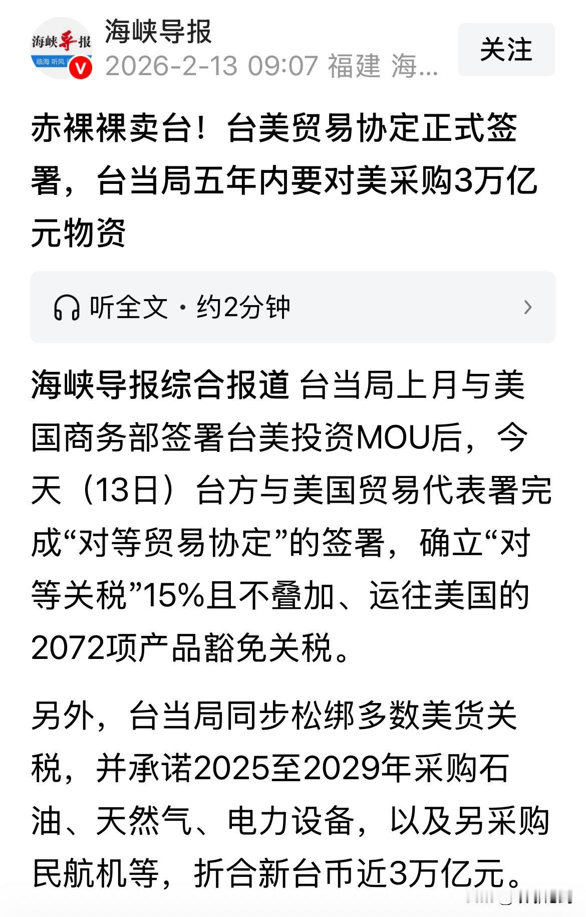 实锤卖台!2026.2.13台美签所谓贸易协定,5年掏空台湾近3万亿新台币 【2026年2月13日 海峡导报综合报道】 继2026年1月15日台当局与美国商务部签署台美投资MOU后,2026年2月13日台方再与美国贸易代表署签署所谓“对等贸易协定”,确立15%对等关税且不叠加,2072项台输美产品豁免关税。 台当局同步松绑多数美货关税,并承诺2025—2029年对美天价采购:444亿美元油气、252亿美元电力/电网/设备、152亿美元民航机及发动机,合计折合新台币近3万亿元,赤裸裸用台湾民众血汗钱交“保护费”。 台湾作为中国地方,根本无权与他国签官方协议!台当局勾连外部势力、无底线卖台,掏空岛内产业、牺牲民生福祉,只为谋“独”自保,必遭全体中华儿女坚决反对,注定死路一条! 台美勾结卖台 一个中国原则 台独必亡