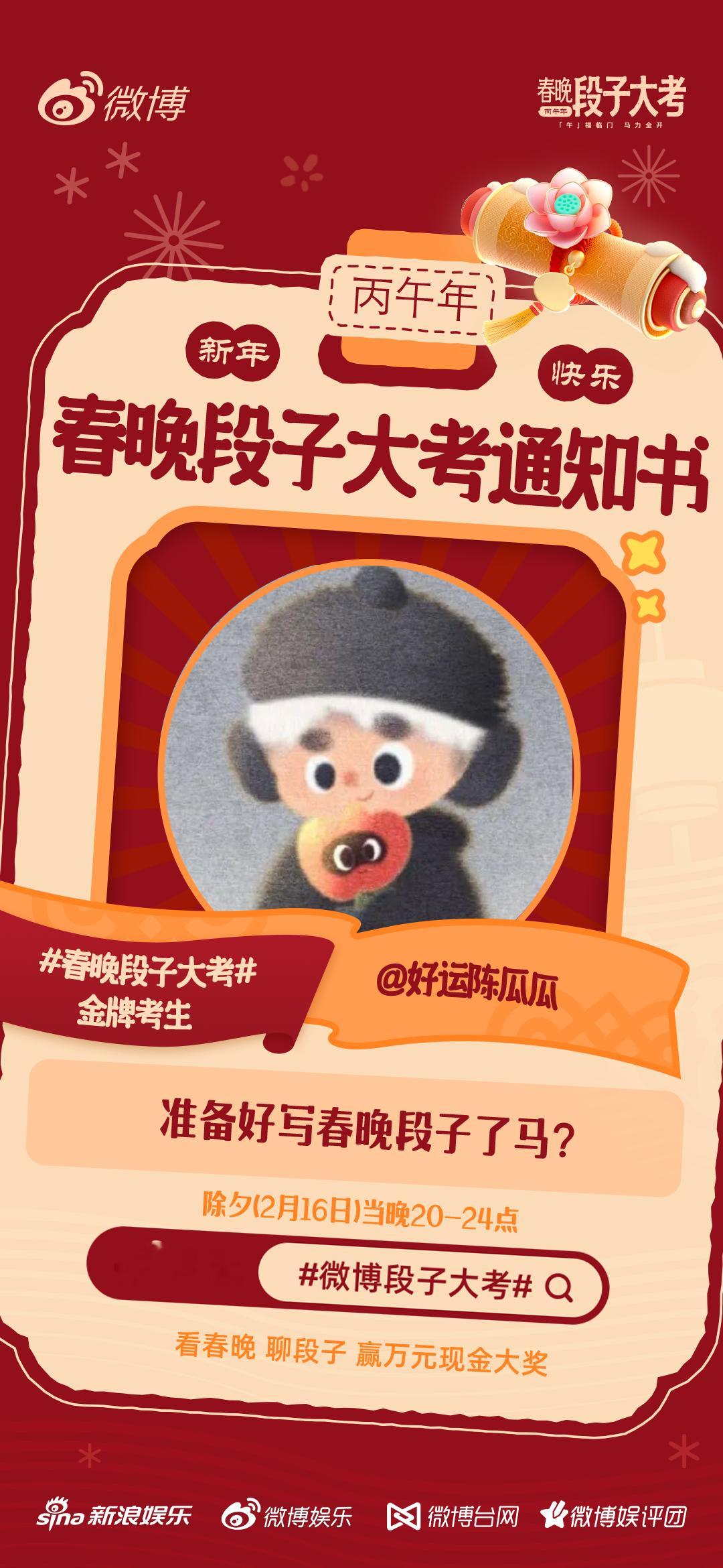 春晚段子大考活动开启!段子组长前来报道!除夕晚上20点正式开考,春晚我们不见不散!