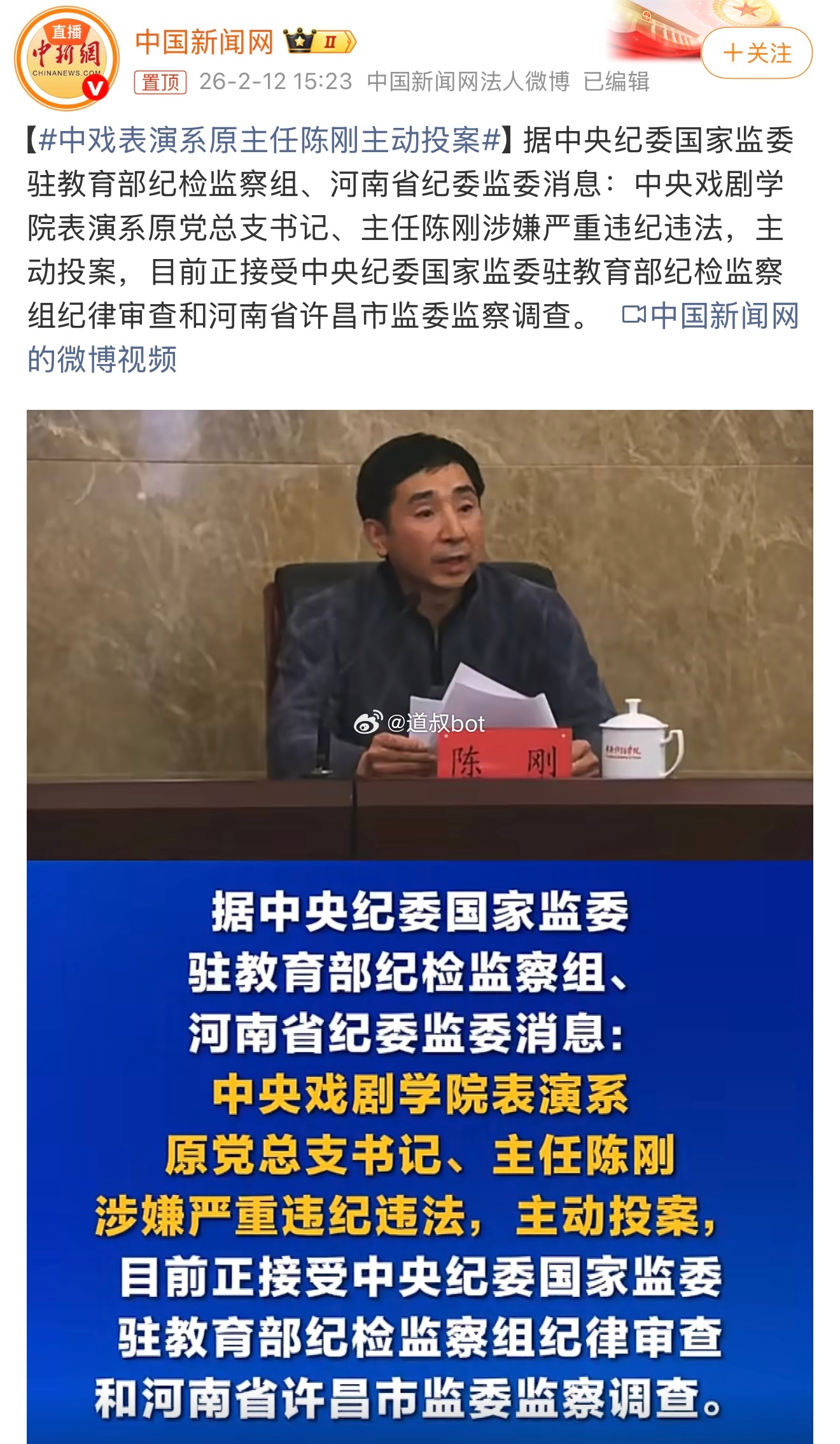 中戏表演系原主任陈刚主动投案