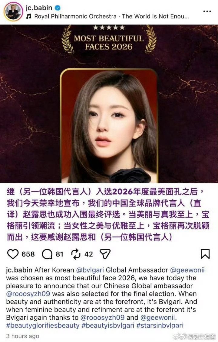 我靠宝格丽CEO不仅发文祝贺赵露思入围全球最美女性面孔,还用了“Global Ambassador”来称呼她,所以赵露思的宝格丽是要升T了吗,这个可是ceo讲的粉丝真的可以接