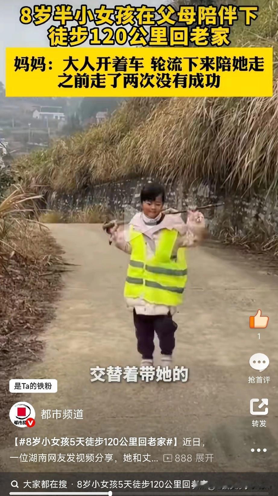 湖南一个8岁的小女孩,为了回老家过年,硬是花了5天时间,徒步走了120公里!