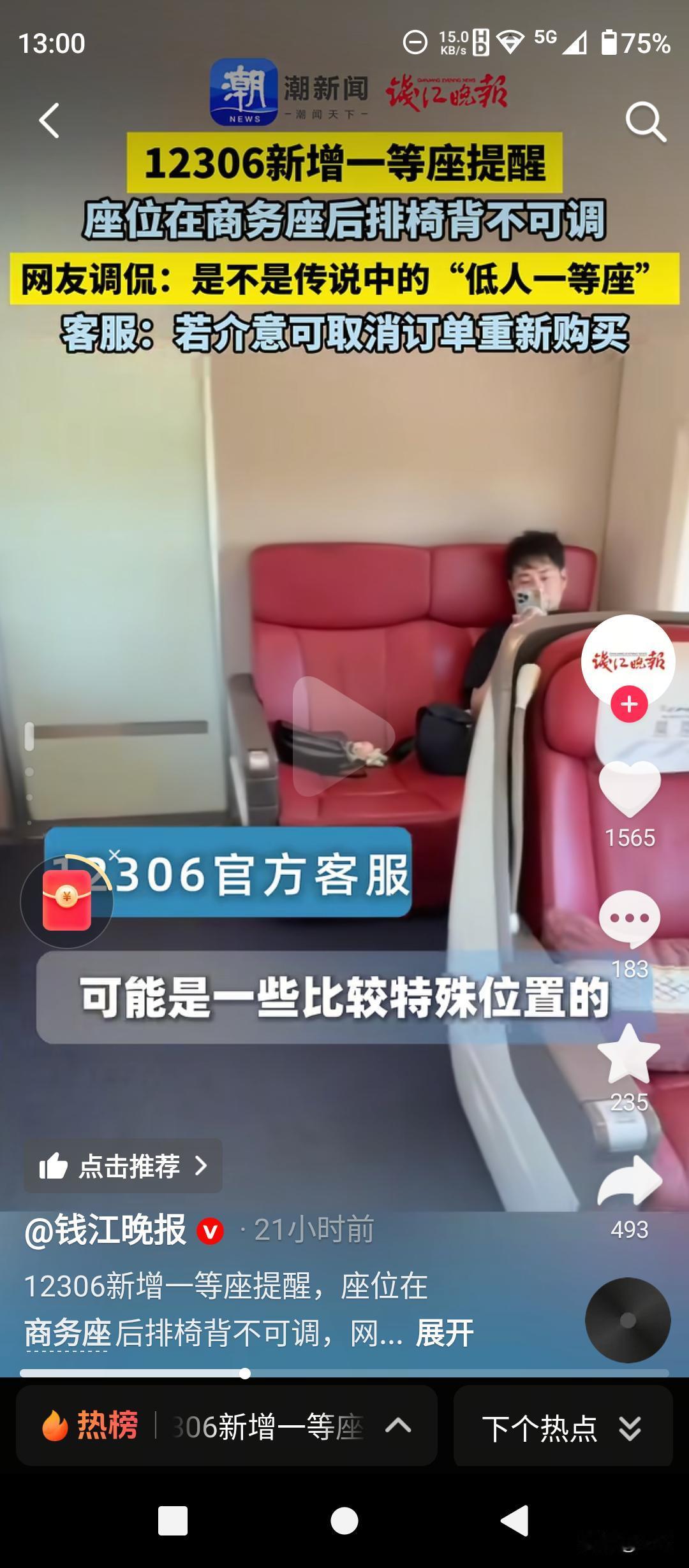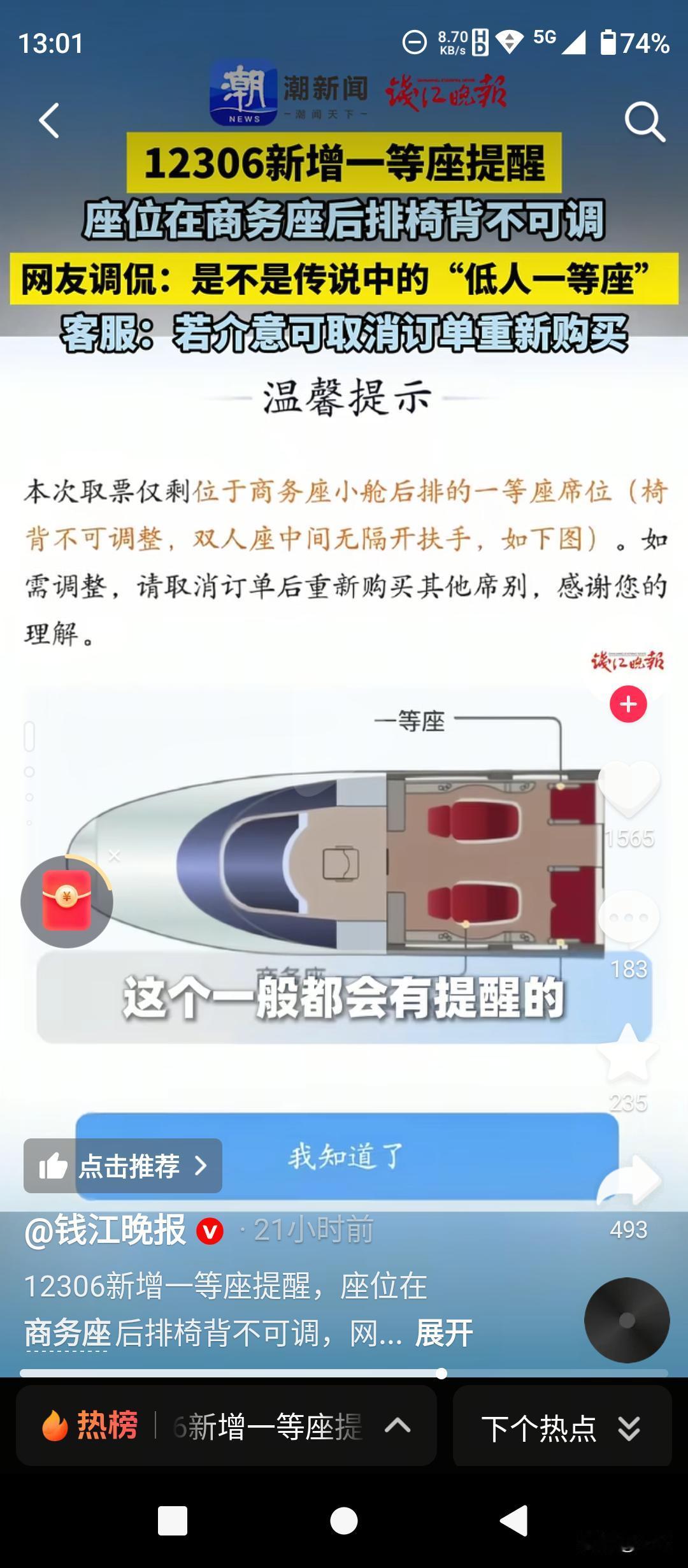 12306这波操作,把“坑”摆在明面上了! 买了一等座,结果坐进商务舱后排的“小板凳”?近日,12306上线一条新提醒,瞬间冲上热搜:“本次取票仅剩位于商务座小舱后排的一等座位(椅背不可调整,双人座中间无隔开扶手)”。 网友戏称的“低人一等座”,终于有了官方“避坑”提示。这类因列车混编产生的特殊席位,花着一等座的钱,却享受不到标准服务——座椅无法 recline,情侣连坐还没扶手,憋屈感拉满。 现在好了,系统直接把“丑话”说在前头。介意?点个“取消订单”,重新选票不扣钱。这不仅是技术的小步迭代,更是服务理念的大步向前:把知情权和选择权,真正还给了旅客。 虽然有网友调侃“春运期间取消就等于没票”,但至少我们能死得明白。比起“开盲盒”式的购票体验,这种坦诚,才是对消费者最大的尊重。 信息来源:南方网、上观新闻