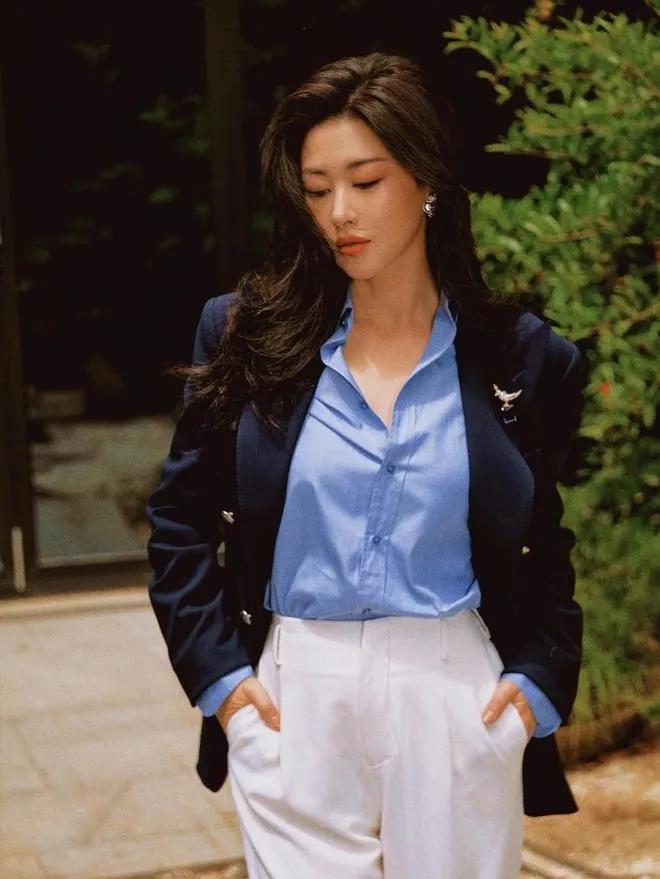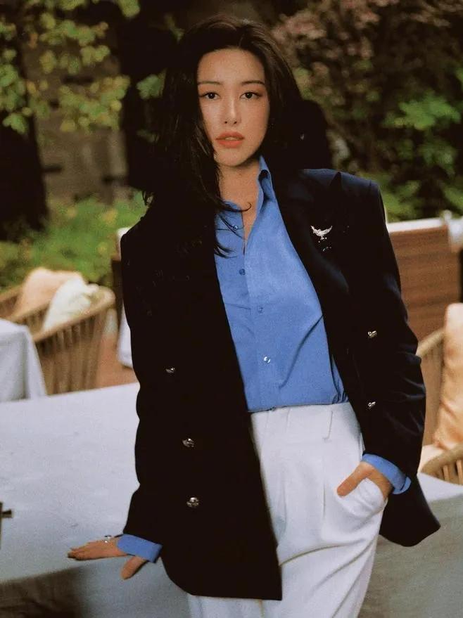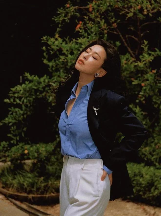 41岁朱珠这穿搭,直接把“高级感”焊在身上!💥 藏蓝西装+蓝衬衫+小白裤,经典配色利落又大气,大波浪卷发衬得她气场全开,双手插兜的瞬间,又美又飒,完全是职场大女主既视感。 朱珠 御姐穿搭 高级感穿搭