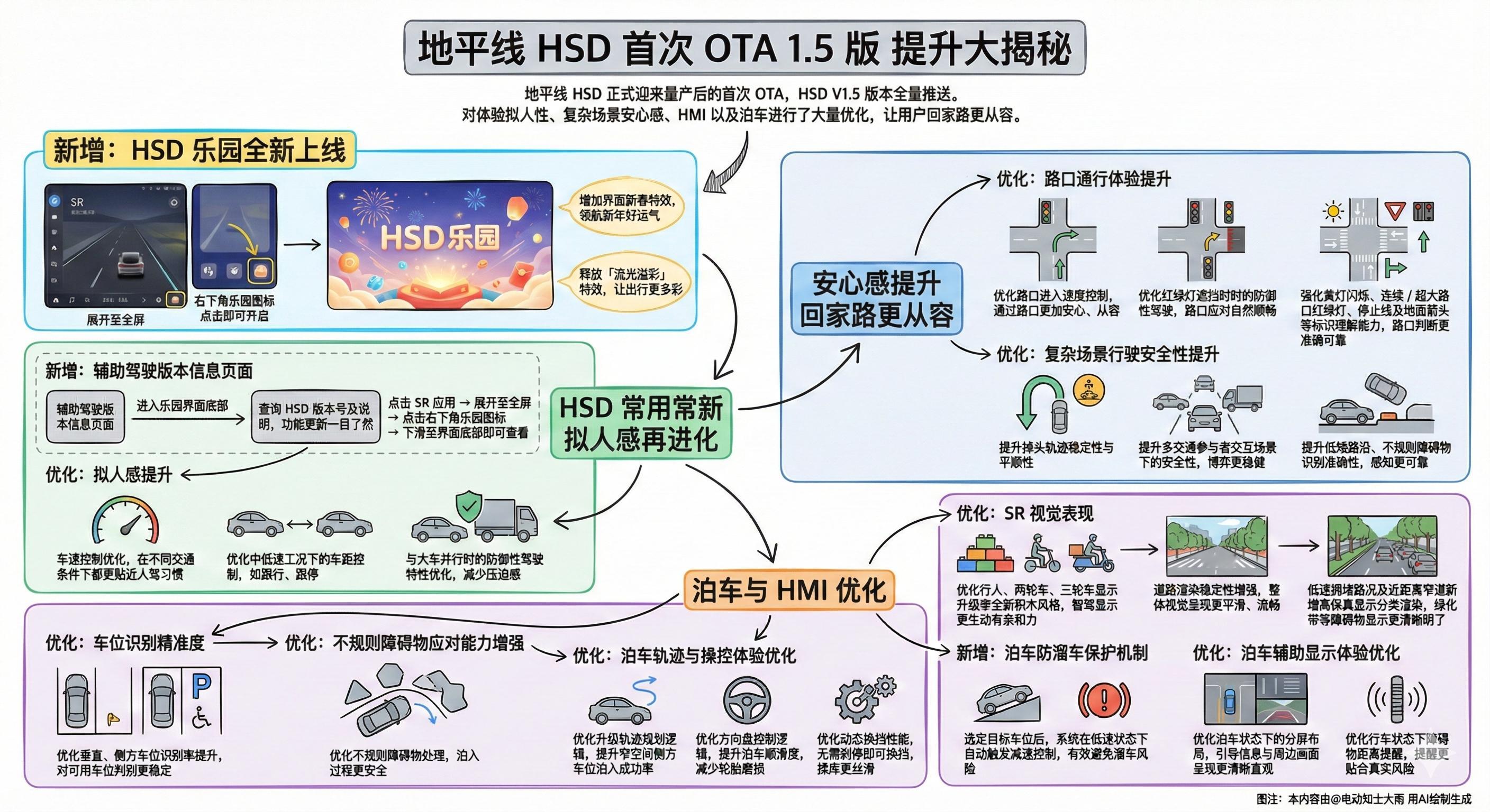 地平线HSD 首次OTA升级至1.5版本,看了下功能更新列表,升级点挺多的,做了张图文并茂的详解图,方便大家阅读哈。