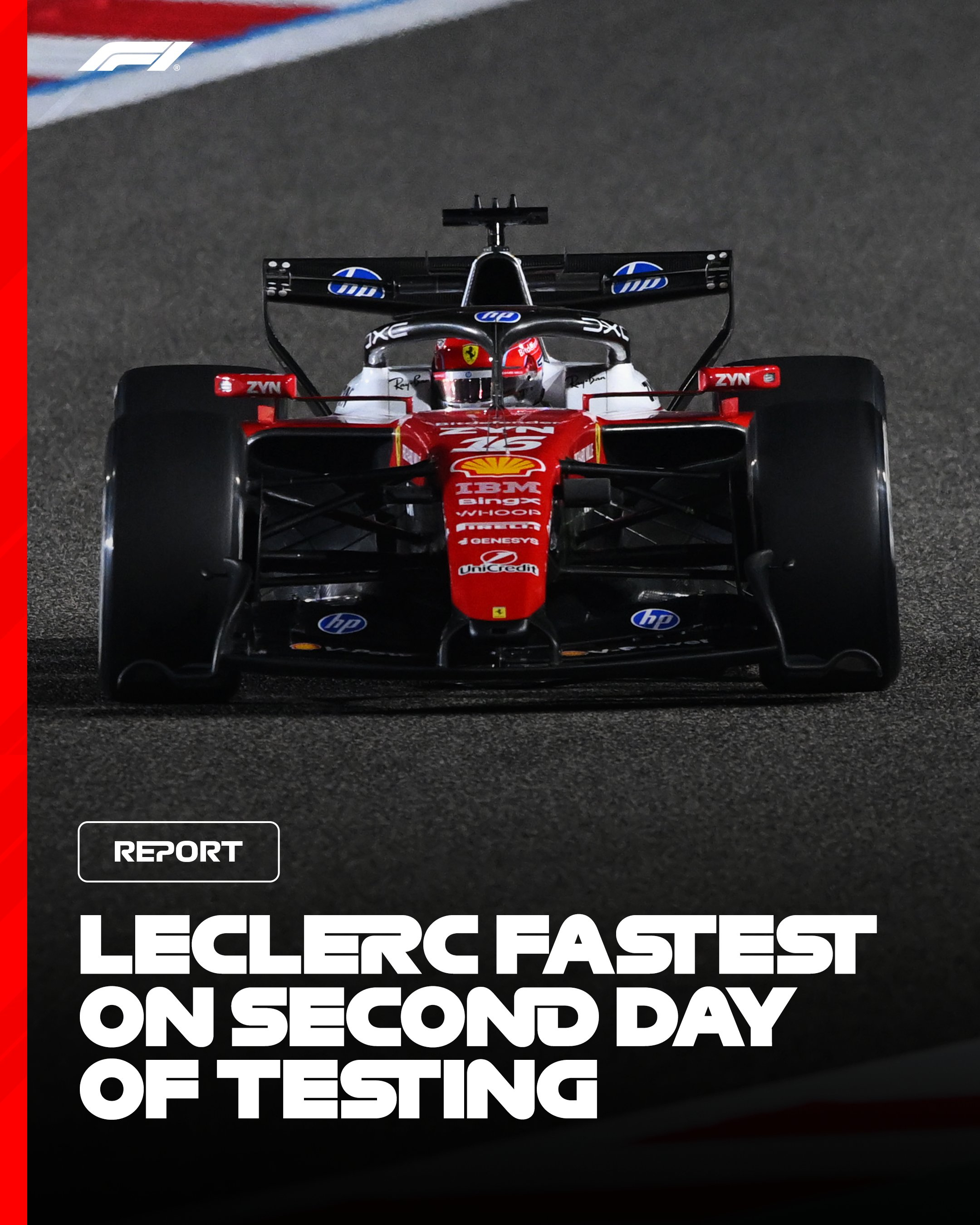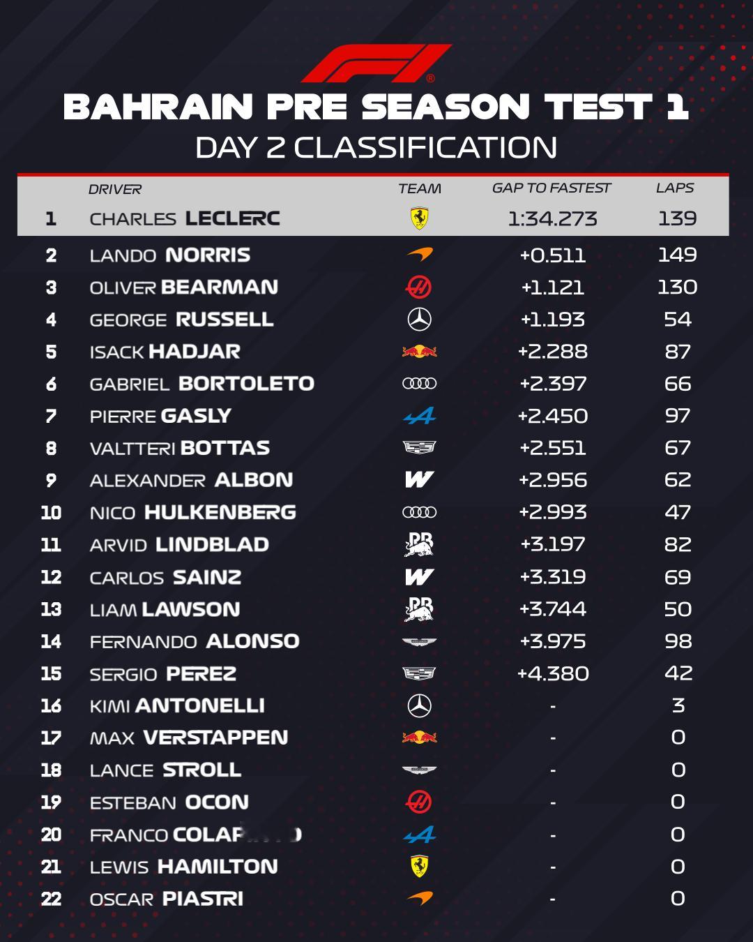 勒克莱尔在第二日测试中跑出了最快圈速,共有七支车队完成了超过 100 圈的测试。