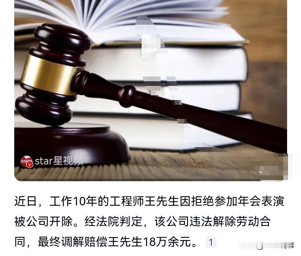 有些公司最喜欢开除那些不听话的人了,例如在年会上要员工表演节目,员工有权拒绝的,毕竟年会表演节目和本职工作无关。 有些公司就喜欢开除不听话的人,一位在公司工作10年的工程师因拒绝参加年会表演被开除。 这公司真的是太缺德了,别人干了10年,竟然把别人给开了,真是一点人情味都没有。 公司最终赔了18万余元。 干得漂亮,这是大快人心啊,就是要让这样乱来的公司付出应有的代价。
