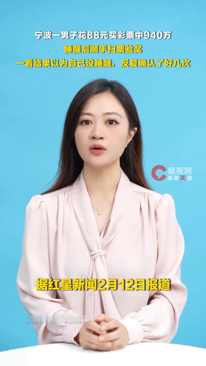宁波一男子花88元买彩票中940万,睡醒扫码验奖以为自己没睡醒。 据红星新闻2月12日报道,浙江宁波的孙先生花88元买彩票中940万一事引关注。得知中奖那一刻,孙先生反复确认了好几次。他称自己睡醒后顺手扫票验奖,一看结果还以为自己没睡醒。 目前孙先生已经顺利领取大奖,他还主动向浙江省体育基金会和浙江省青少年发展基金会各捐赠1万元,以实际行动为公益事业添砖加瓦,让这份幸运传递出更多温暖。