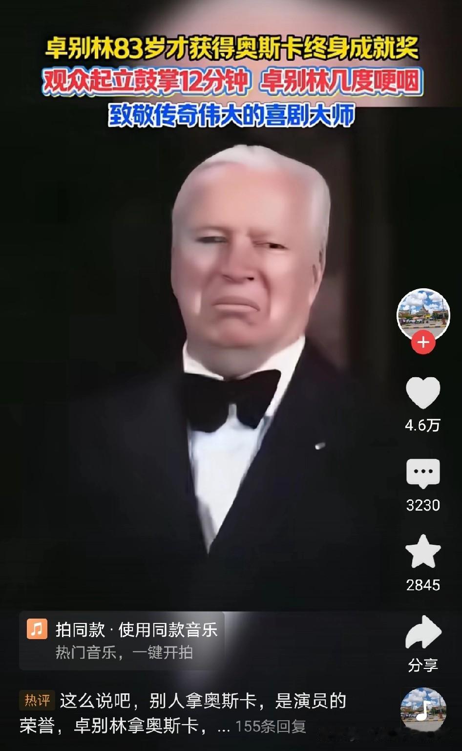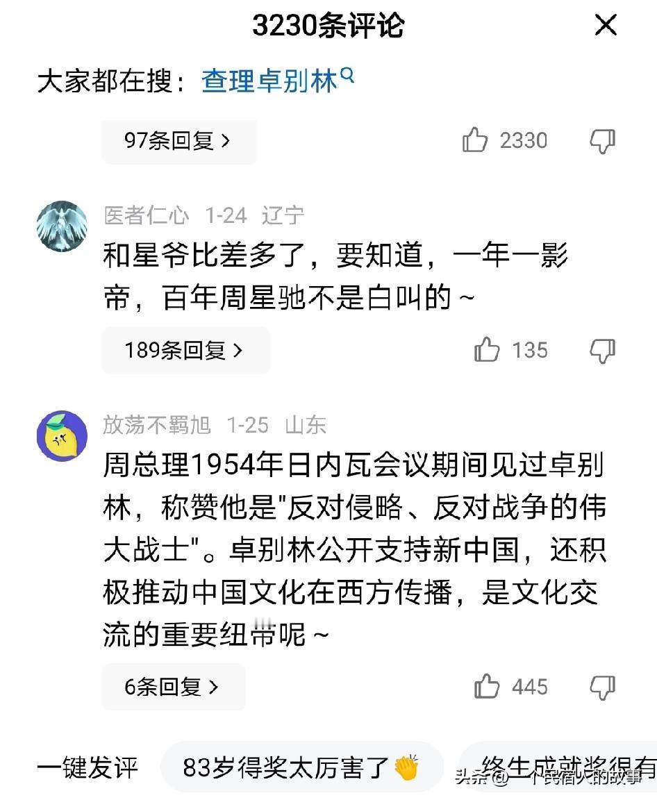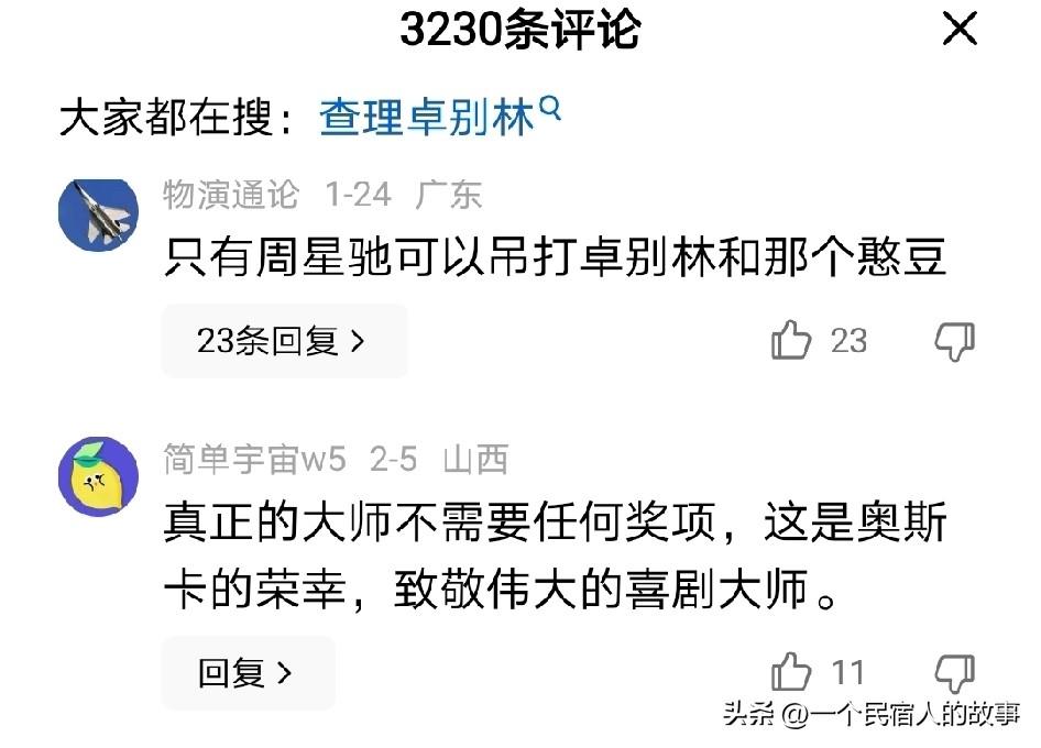 周星驰粉丝碰瓷卓别林声称:卓喜剧毫无深度周喜剧让人泪流!周吊打卓! 刚才刷头条给气笑了,刷到一个20世纪最伟大的喜剧大师卓别林晚年领奥斯卡终身成就奖的影片,结果评论区周星驰的粉丝让人笑掉大牙,不要脸文盲程度让人咋舌,说什么:周星驰吊打卓别林憨豆、卓别林和星爷比差多了,百年周星驰不是白叫的!更是声称:卓别林喜剧毫无深度只停留在好笑,而周星驰喜剧能洗涤灵魂捧腹泪流! 我都不想骂这些玩意了,当年香港台湾影评说,周的喜剧除了屎尿屁和三流伦理梗啥都没有!只有在大陆被当年北影那帮人从《大话西游》吹出了一个后现代解构主义,才被捧上天。现在他的粉丝却到处膈应人,捧一踩一。