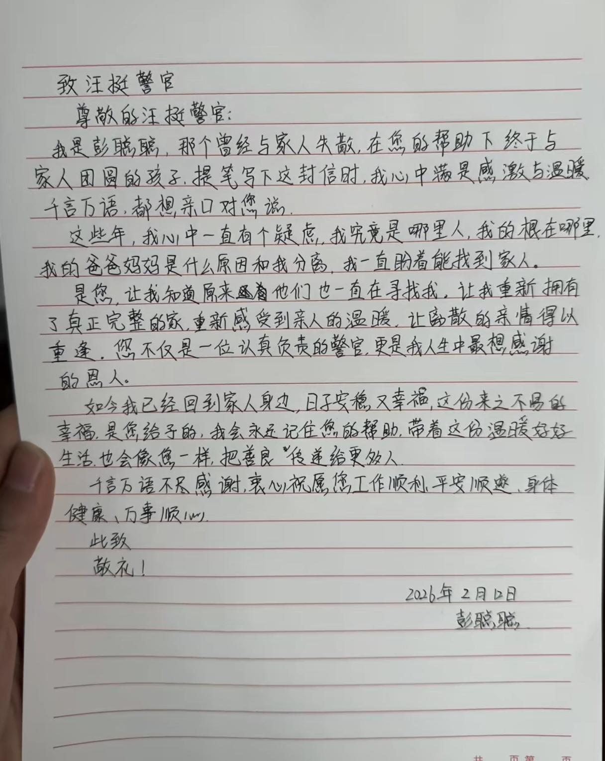 这个礼物有心了! 过年了,彭聪聪去感谢找到他的汪警官,因为公职人员是不允许收礼的,所以彭聪聪手写了一封信交给汪警官,这是一份特别的礼物。 以前知道江西这个帽子叔叔找到了很多孩子,比如彭聪聪,师珂,但是不知道他找到了那么多。 彭聪聪去感谢他的时候,满满一墙的照片,我感觉得有几百个吧,都是他找到的孩子,这也太厉害了吧。 其实很多孩子找到以后比较低调,没有带货的也没有上网,我们不知道。 这几年有特别多的孩子找到了,看到这满墙的照片就感受到了数量之多。 说来也是奇怪,找到了这么多孩子了,硬是找不到小米奇,着急啊!