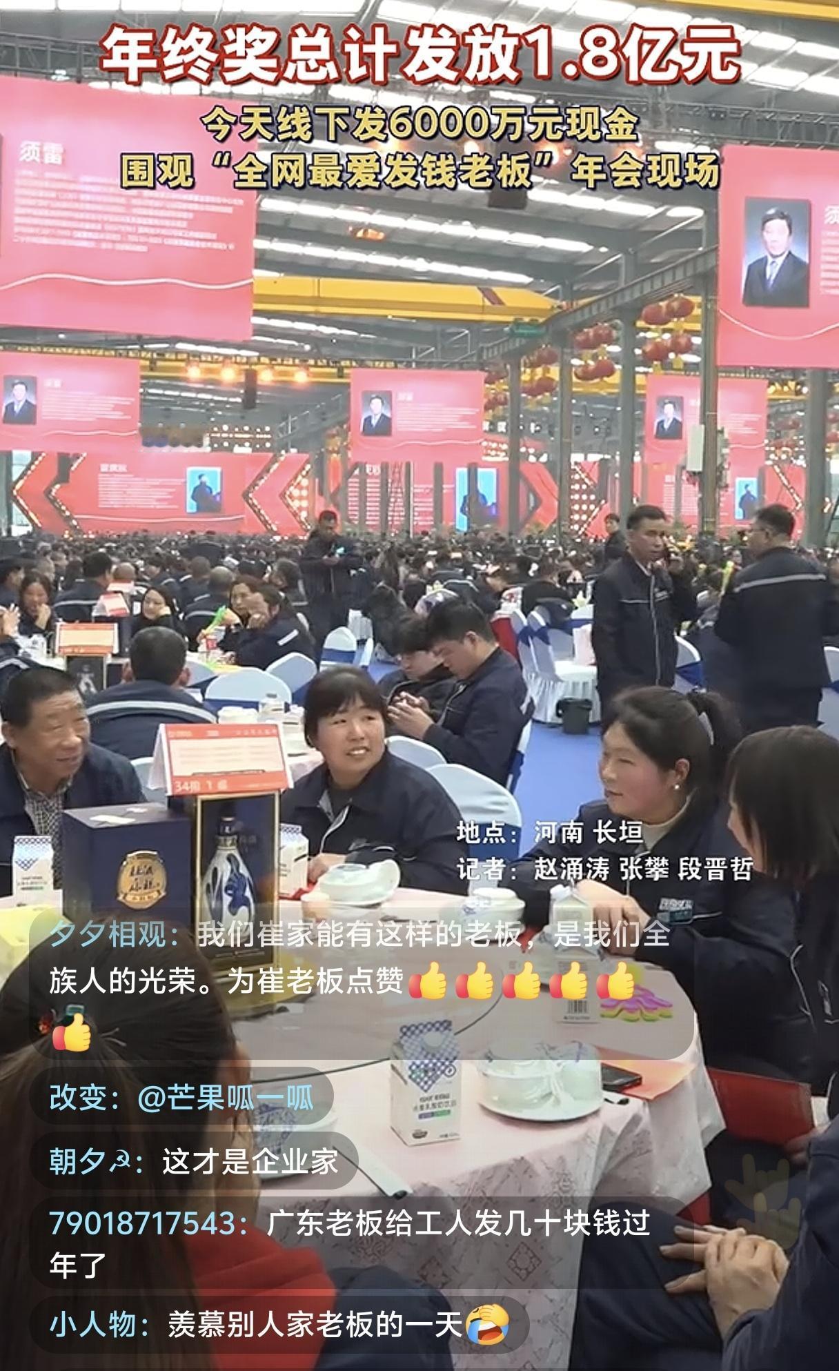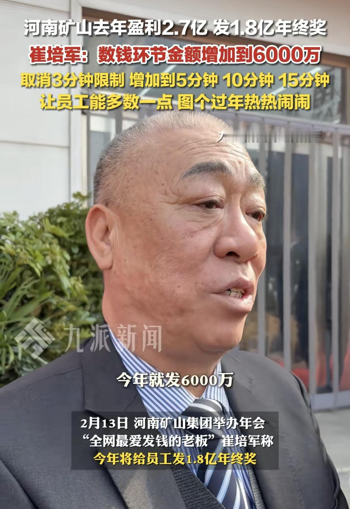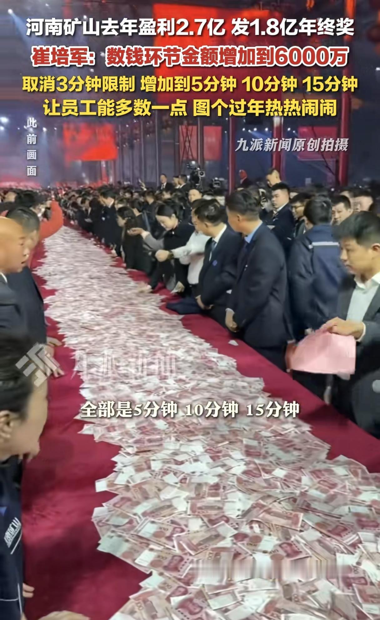 盈利2.7亿,发年终奖1.8个亿,河南矿山的老板今天又刷屏了。很多人在直播他们开年会的场面。 别人的企业开年会都是员工表演给老板看,河南矿山开年会是请明星表演给员工看。 河南矿山发年终奖还有一个比较刺激的环节,现场数钱,数多少拿多少。 以往限时3分钟,今年设置了三种,5分钟,10分钟和15分钟。 我好想知道15分钟能数多少钱,有人说能数十几万,有那么多吗? 这个老板太豪了,有了抖音才知道,人家的老板是真的又好又豪呀! 人家不只是发钱多,腊月二十三就放假了,给员工发的新年礼物都得开着三轮车去拉。 把员工当人看,舍得把利润分下去,心齐了,自然不会差到哪里去。 抖音真好啊!让我们见到了这么多大方的公司,还有机会的朋友们向着这个公司努力吧。