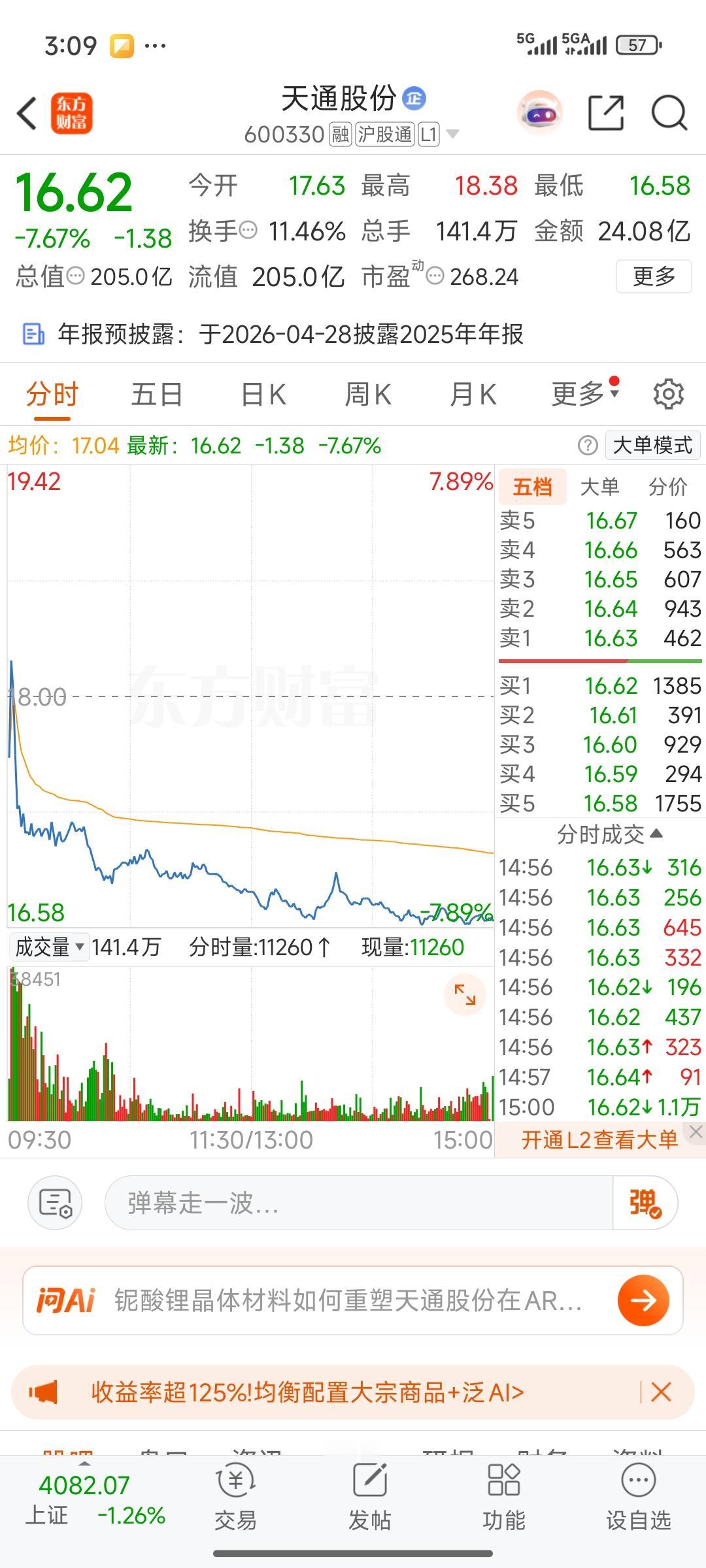 太惨啦!本以为过年、过春节,村里兴许会发个红包,结果啥都没有。 再看天通股份,今天收出一根大阴线,直接逼近20天均线,估计接下来要调整一阵子了。好在成交量稍有萎缩。 只能寄希望于来年开春之后再“战斗”了。在此,预祝各位股友新春快乐! 马年发财。马到成功!地天板股票 天普股份龙虎榜 航空天板块 天特股份 天通卫星通讯 润通股票 天通通信