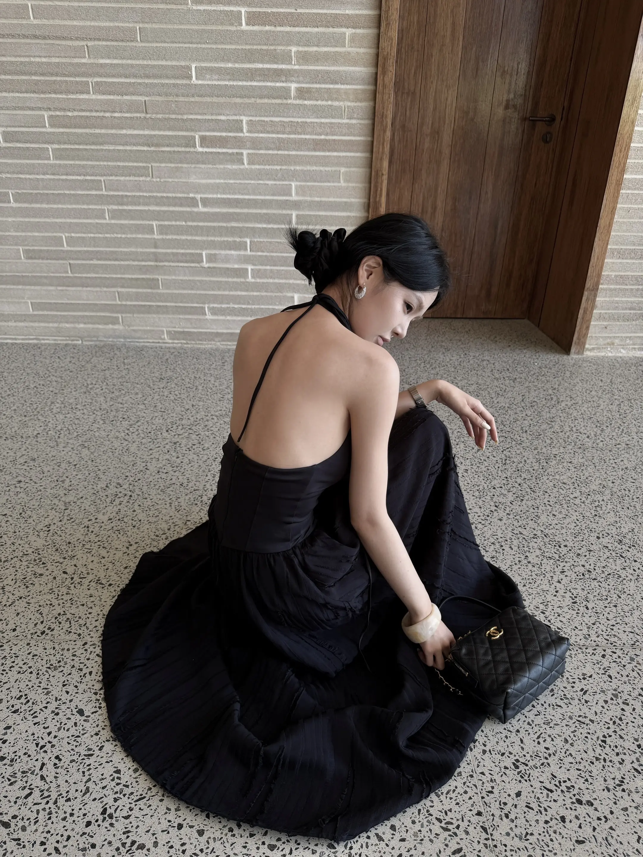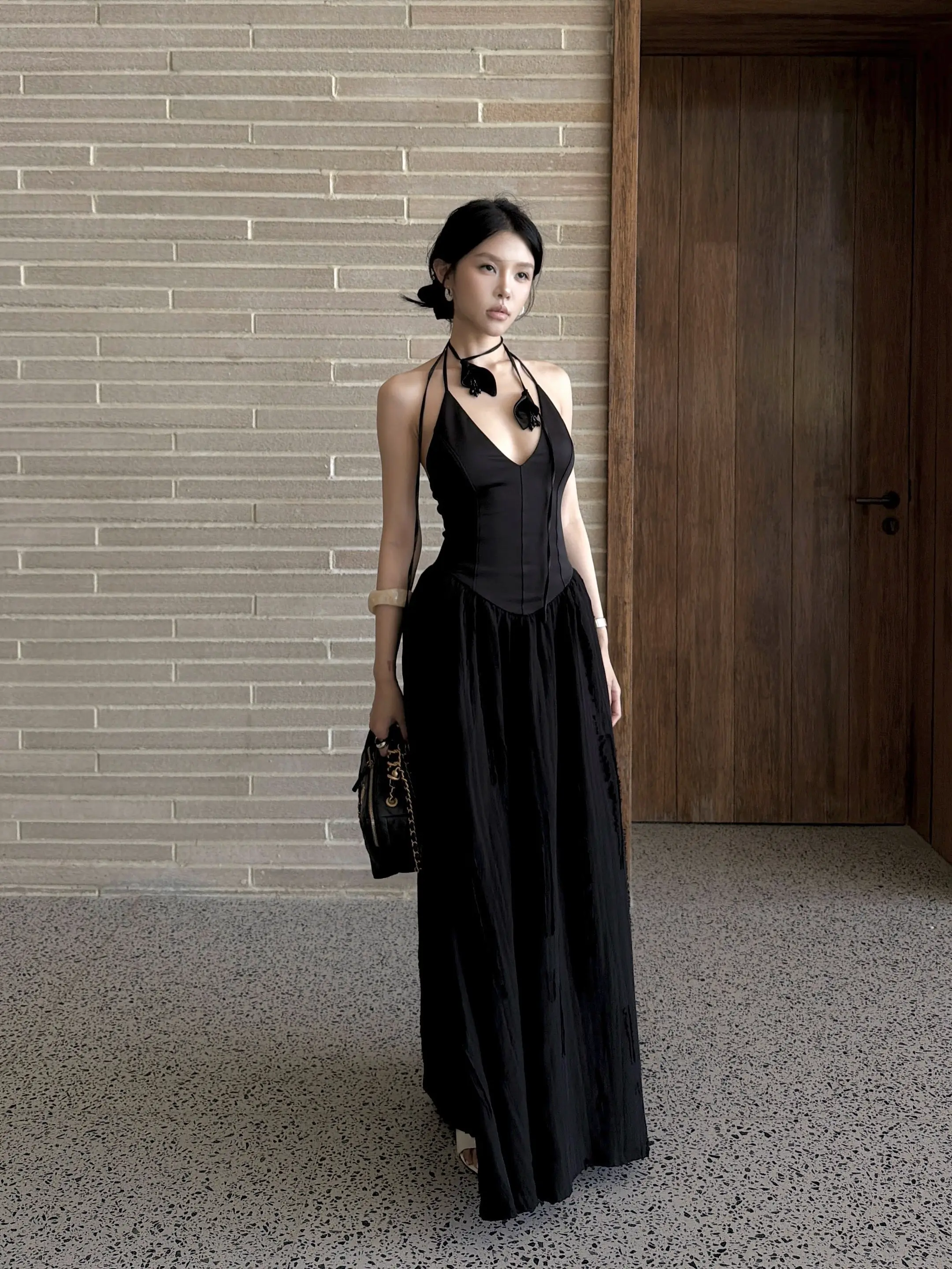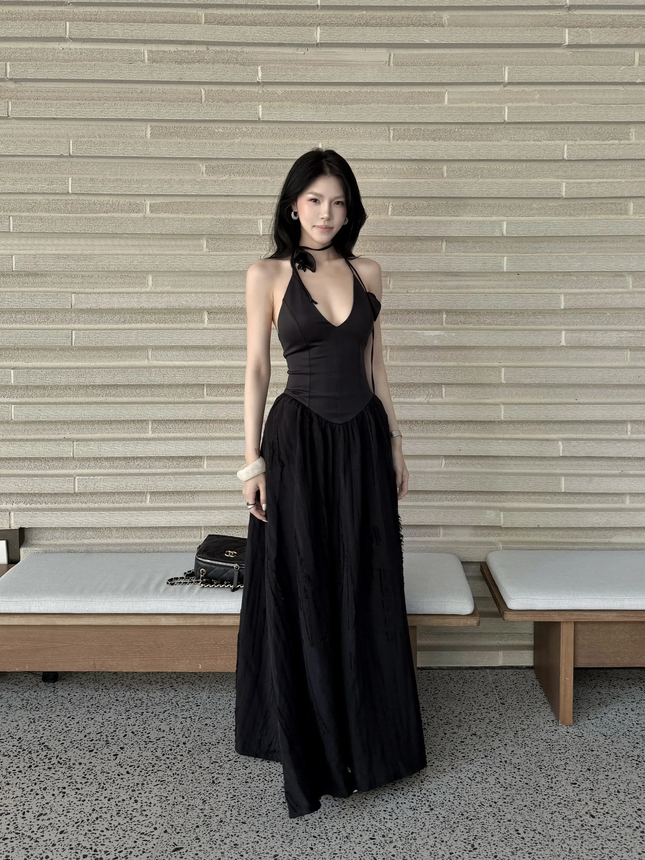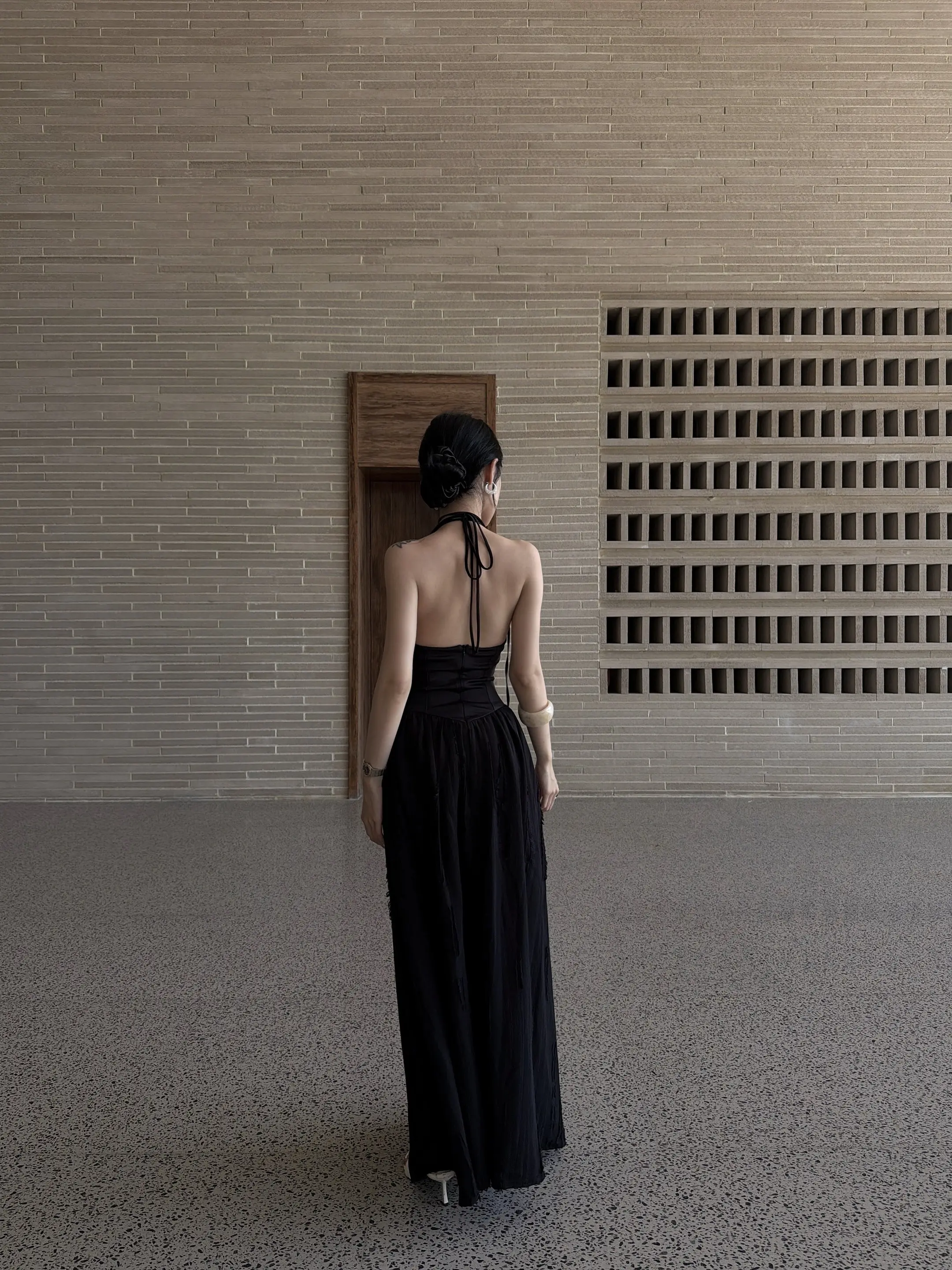 竖条纹旗袍的开叉恰到好处,衬得腿型修长,线条舒展而柔和;肤色均匀且细腻,姿态优雅