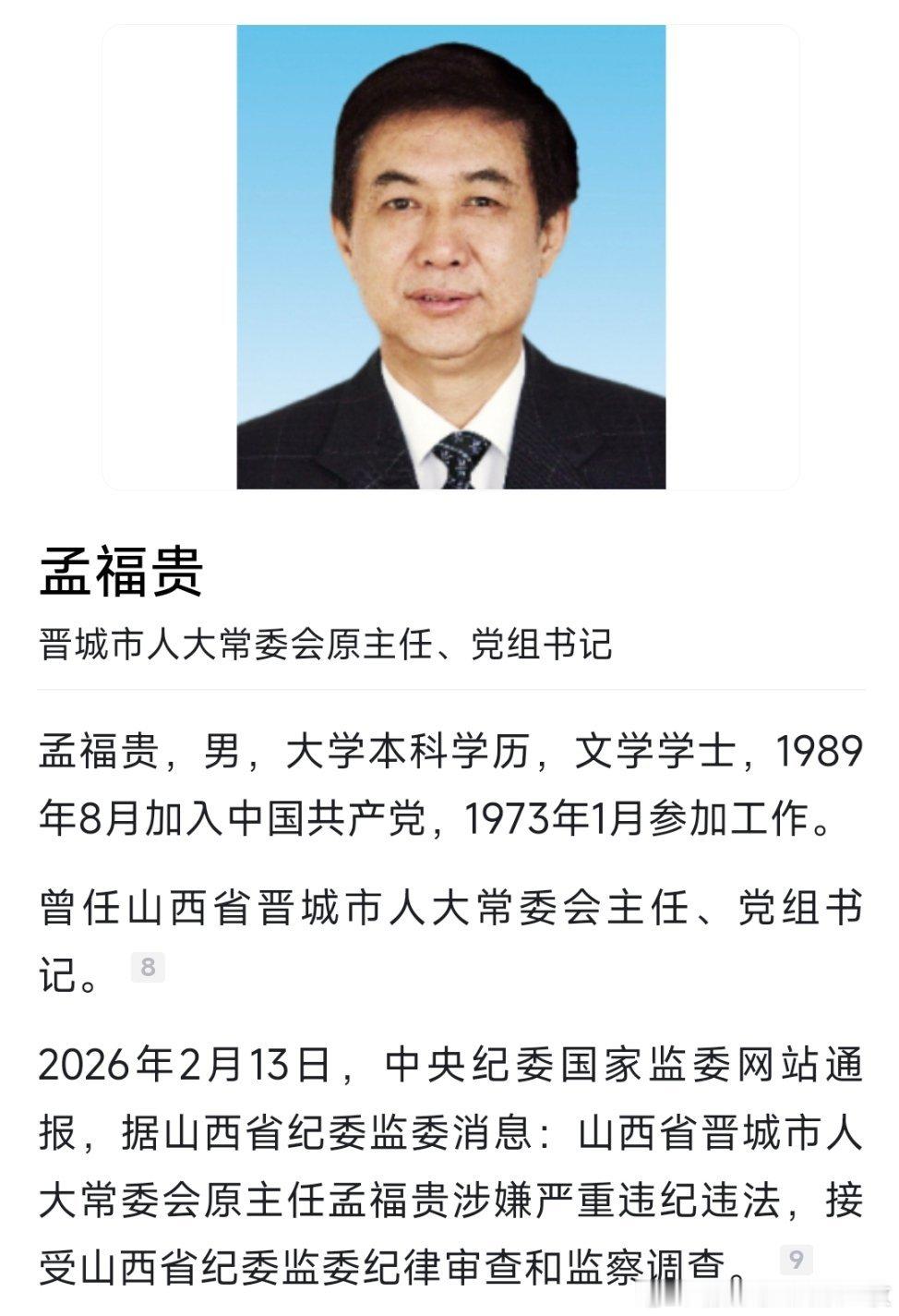 晋城市人大常委会原主任孟福贵接受纪律审查和监察调查。