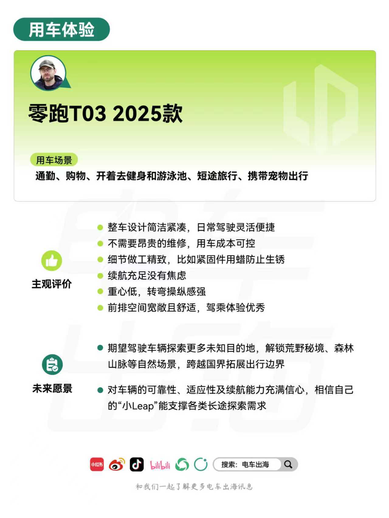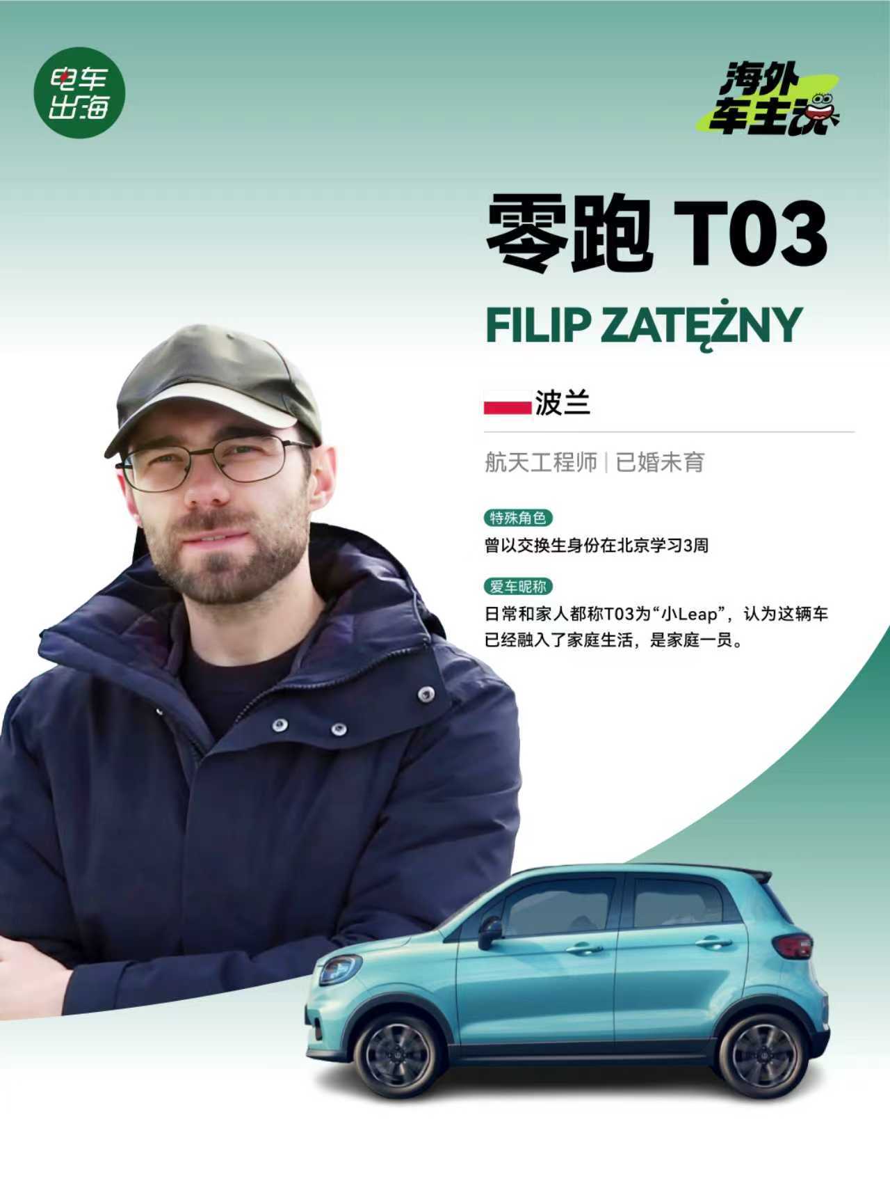 车主:FILIP ZATEZNY国家:波兰🇵🇱个人情况:航天工程师,已婚未育,曾以交换生身份在北京学习3周;爱车昵称:日常和家人都称T03为"小Leap",认为这辆车已经融入了家庭生活,是家庭一员;购车成本:约8万波兰兹罗提;用车场景:通勤,购物,开着去健身和游泳池,短途旅行,携带宠物出行。
