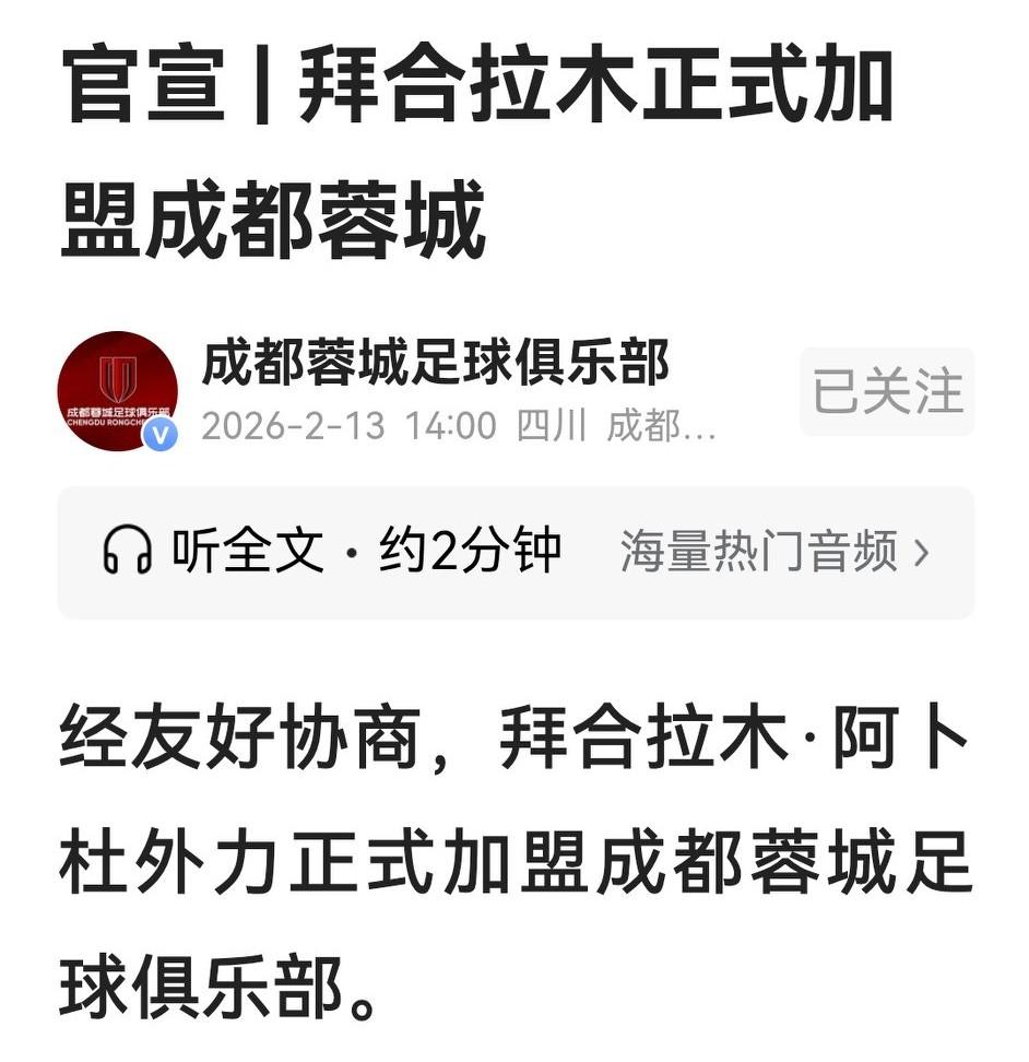 官宣了,官宣了,双料国脚拜合拉正式加盟成都蓉城,令成都球迷非常振奋! 拜合拉木加盟,对蓉城来讲,丰富了锋线选择,拉低了平均年龄,提升了前场硬度,增强了队伍活力,进一步点燃了凤凰山激情,成都蓉城特别需要这位新星。 有人吐槽拜合上赛季0球0助,实际上缘于深圳队坚持打传控,脚下活不细的小拜老是浪费表情。但在两级国足可不一样,小伙子展现了高出一筹的体能和敢打敢拼的精神,这正是蓉城及球迷喜欢的类型。 大胆做个预测,拜合拉木今年在蓉城进球数,可望排进中超前10名。