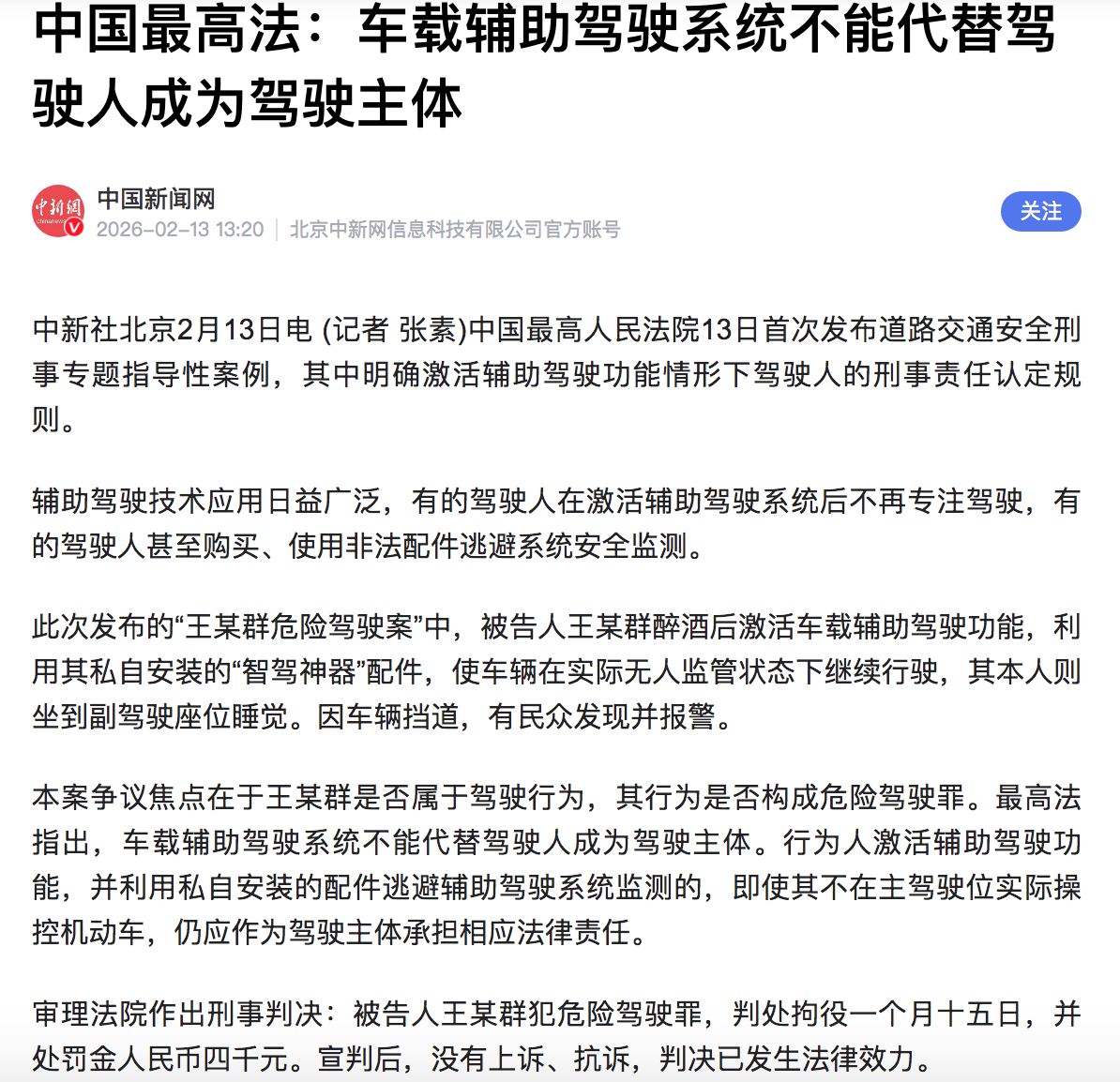 最高人民法院:车载辅助驾驶系统不能代替驾驶人成为驾驶主体。