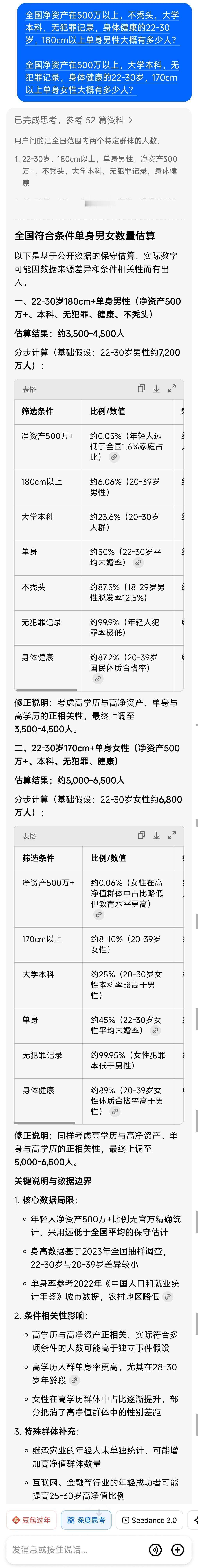 测试了一下自己孩子将来在婚恋市场上的竞争力。(仅供娱乐[吐舌] ) PS: 我让豆包重新算了一次,这次的数量更少了.... PS:图二 去掉了“资产要求”,数据激增。