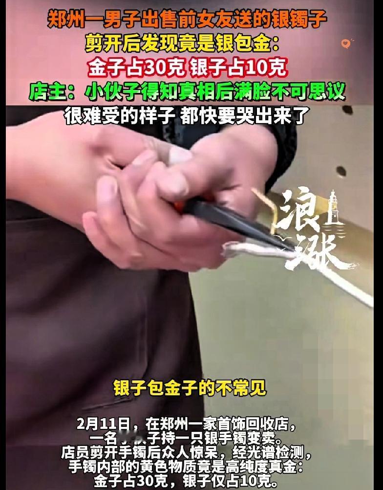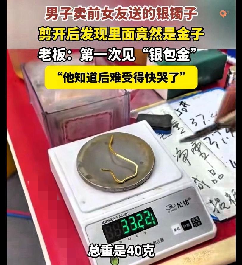 这才是藏在细节里的真爱啊! 郑州一男子缺钱,把前女友送的银手镯拿去变卖,店员剪开验货时,所有人都看呆了。 外面一层是普通白银,里面居然全是足金,40克的镯子,黄金就占了30克。 他一直以为这只是个不值钱的小礼物,直到剪断的那一刻,才明白姑娘藏了多深的心意。 她不说爱,却把最实在的温柔裹在银饰里,就怕他哪天落魄了,能靠这个渡过难关。 最扎心的是,男子拿到能换几万块的镯子,没有半点开心,只剩后悔和心酸。 他卖掉的不是首饰,是一个姑娘毫无保留的真心,是这辈子可能再也遇不到的偏爱。 钱能应急,可弄丢了满眼都是你的人,多少钱都换不回来。 你觉得他是可惜钱,还是可惜人?换作是你,会卖掉这份心意吗?