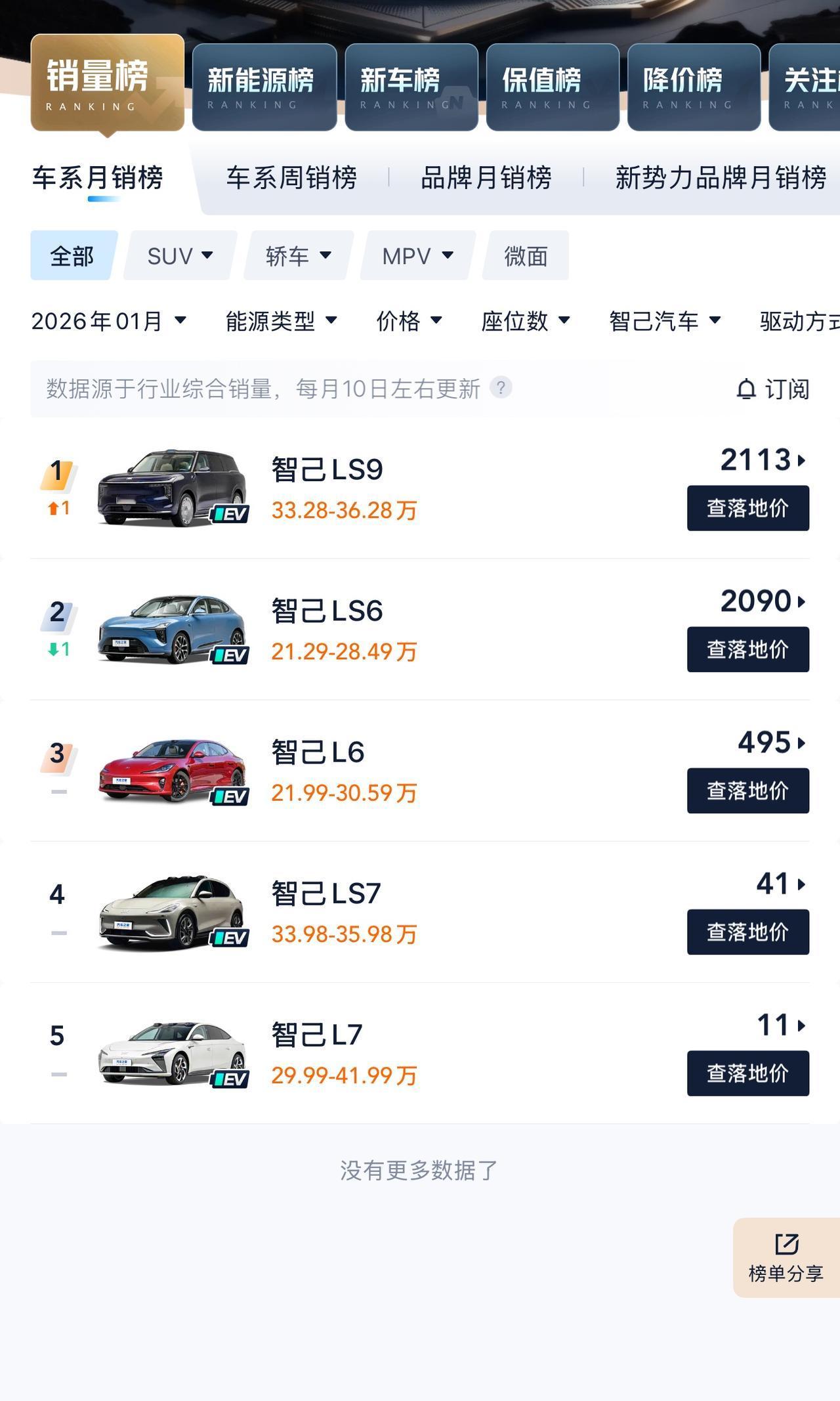 2026年电车彻底不行了?[捂脸]最近1月份销量排名出来了,不看不知道,一看吓一跳!总销量排名前10里面,居然只剩下3台电车了?作为对比,去年12月份,销量前十里面足足有9款是电车!这才过一个月,前十里面咋就只剩下3台电车了? 其实这样也好,大浪淘沙,在更加严苛的环境下,最终只会留下真正有实力的选手。比如智己,旗下的车型1月份销量就没有受到明显波动,看排名基本不上不下。为啥智己的电车销量这么稳定呢?最主要还是产品力这一块,比如智己LS9,主打全尺寸大六座旗舰SUV,内饰配置、电池电控都没得挑,动力也好空间也罢或者续航里程,全系标配390KW双电机,在同级别都是遥遥领先,也难怪销量能这么稳定了!
