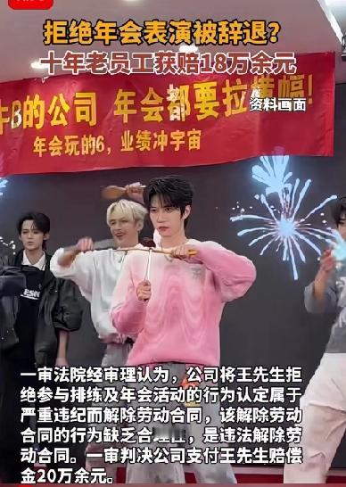 年会表演是员工必须履行的工作吗?10年老员工因为拒绝年会表演竟然被公司辞退!18万赔偿明确职场边界 近日,网上爆出武汉一男子因拒绝公司年会表演被辞退,经法院二审调解获赔18万余元的案件。 据悉,该男子在武汉某公司任职10年,临近春节,公司组织全员参与年会表演彩排及活动。男子以年会表演非本职工作为由明确拒绝,彩排期间男子仍坚守岗位完成工作。公司却认为其拒不服从管理、违反集体活动要求,以"拒绝参与年会表演彩排及缺席年会活动"为主要理由,向其出具《解除劳动合同通知书》,单方面终止劳动关系。 被解雇后,男子选择通过法律途径维权。案件先后经劳动仲裁、一审法院审理。一审法院认为,年会表演属于企业文娱活动,并非劳动者法定或劳动合同约定的工作义务,判决公司支付赔偿金20万余元。公司不服判决提起上诉,武汉中院二审组织双方调解,最终达成一致,公司一次性支付男子赔偿金、工资差额等共计18万余元,目前款项已履行完毕。 团建,年会等娱乐活动本是员工自愿,大家在完成工作之后如果有精力就去参加,如果不乐意也不必要强求。就拿年会表演来说,公司希望员工通过表演来活跃气氛,展示团队风采,这本无可厚非。但如果将其上升到工作任务层面,强制员工参与,就变了味。对于那些性格内向、不善表演的员工而言,这无疑是一种巨大的压力。 从员工角度来看,他们进入公司是为了完成本职工作,获取相应报酬。而额外的年会表演、团建活动等并非他们工作的核心内容。强迫员工参与,可能会让他们产生抵触情绪,甚至影响到正常工作的积极性和效率。