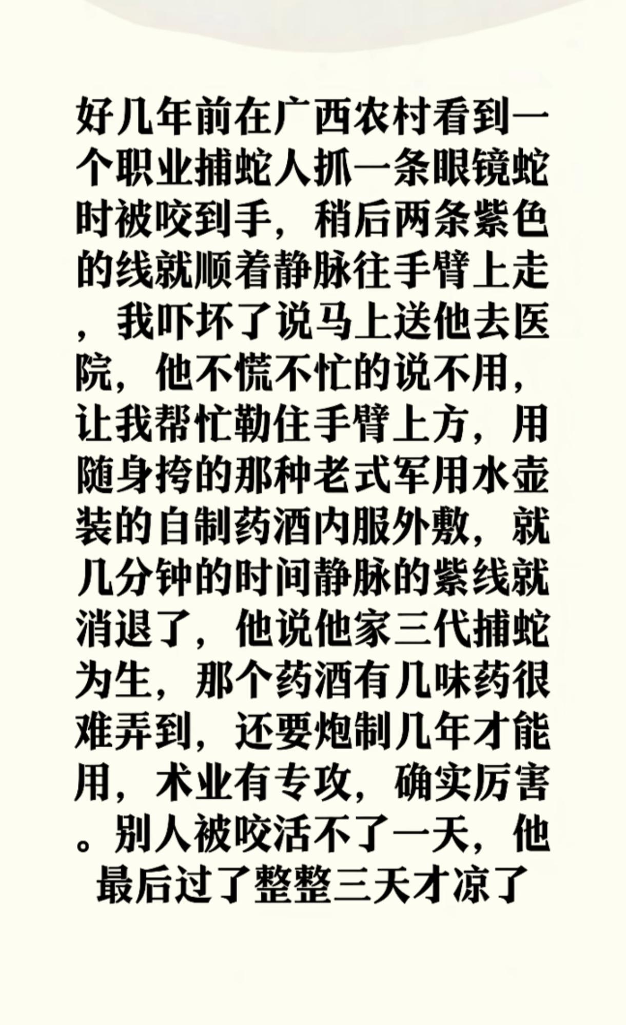 好文章!结尾才是点睛之笔[赞] 整整多了三倍的生存期,说明人家职业捕蛇人的药确实有效啊[捂脸]。我感觉是这样子的,他是本来可能是有的救的,他就是太相信他的祖先的那个药了。我曾经遇到过这样的人,话术是一样的,被蛇咬也是一样的,卖药酒从一千一斤降到一百一斤。我就是不买[大金牙][大金牙]因为他说他药里面有虎骨!