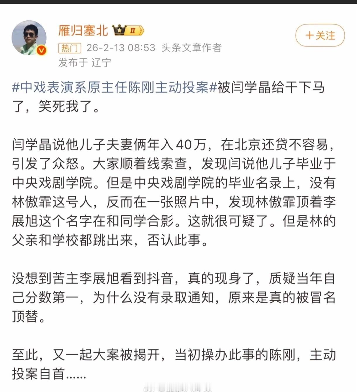 刚刚看到一个新闻:中戏表演系主任投案了!不知道是不是拔萝卜带出来的泥!他们那么有钱了,为什么不知足呢?这样也能去顶替,可是李展旭的人生就这样被毁了啊!真的是太过分了,真的应该全网抵制闫学晶一家,让他们也感受感受一下普通人收入的日子!