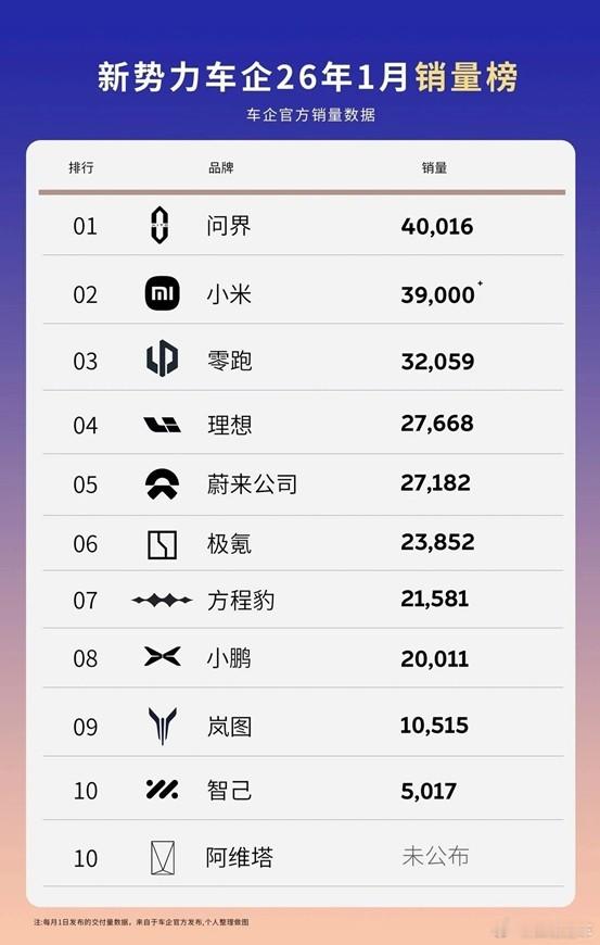 2026年开年,造车新势力的交付榜单呈现出一种微妙的分化。环比数据普遍走低,跌幅两位数的品牌不在少数。但若将视线拉长至同比维度,局面则是另一番光景。有人从牌桌上滑落,也有人站上了新的位置。