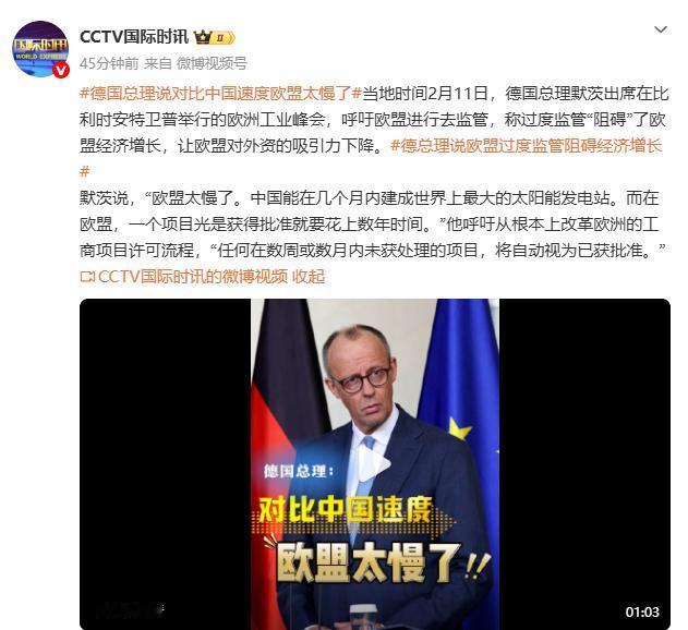 德国总理默茨今天在欧洲工业峰会上发言说:“中国在短短几个月内建成了世界上最大的太阳能发电厂。在欧盟,一个项目光是获得批准就需要数年时间。因此,我建议在大多数审批流程中实施一项基本原则:任何在几周或几个月内未得到处理的项目将被视为自动获得批准。” 这番话一出口,直接在欧洲政坛炸开了锅,一向以严谨规则自居的欧盟,被自己的核心大国总理当面点出效率短板,还公开拿中国速度做对比,足以看出欧洲当前的产业焦虑已经到了藏不住的地步。 默茨会说出这样的话,并不是临时起意,而是欧洲工业竞争力持续下滑后的清醒认知。过去十几年里,欧盟一直沉迷于完善各类监管规则,从环保评估、土地审批、劳工合规到民众听证,一个新能源项目想要落地,往往要经过十几道流程,平均耗时超过五年,部分复杂项目甚至要等上八年十年。 等所有手续走完,市场风口早已过去,技术迭代也完成了好几轮,企业投入的耐心和资金都被漫长的审批消耗殆尽。与之形成鲜明对比的是,中国在新能源基建领域有着清晰的规划和高效的落地能力,从选址、建设到并网,全程流程简化、部门协同,大型光伏电站、风电基地能在数月内建成投产,这种效率让欧洲企业既羡慕又焦虑。 从数据上看,中欧在新能源领域的差距正在持续拉大。过去五年,中国光伏组件产能占全球七成以上,风电装机量连年位居世界第一,新能源汽车产量占全球一半以上,这些成绩的背后,离不开高效的项目审批与建设速度。 而欧盟虽然提出了碳中和目标,规划了大量新能源项目,但受限于审批效率,实际落地量不到规划的三成,很多企业拿着技术和资金,却卡在流程上动弹不得。德国作为欧洲工业龙头,感受最为明显,大众、宝马等车企在中国市场快速布局新能源产能,回国后却发现建设工厂要等数年审批,这种内外效率差异,让德国制造业的优势不断被蚕食。 默茨提出的 “超时自动获批” 规则,看似激进,实则是对症下药。他的目标很明确,就是砍掉欧盟多余的繁文缛节,打破成员国之间的审批壁垒,让项目落地速度跟上产业发展节奏。 在峰会上,默茨直言不讳地指出,过度监管已经成为阻碍欧洲经济增长的最大绊脚石,过去欧盟总把竞争力下滑归咎于外部竞争,却忽略了内部流程臃肿、效率低下的核心问题。如今中国用实实在在的建设速度证明,高效的流程管理,才是产业竞争力的关键支撑。 这次发言也释放出一个重要信号,欧洲的对华认知正在发生转变。过去很长一段时间,欧盟部分势力习惯于戴着有色眼镜看待中国发展,在技术、产业等领域设置壁垒,很少正视中国在效率、基建、产业落地等方面的优势。 而默茨作为德国总理,公开认可中国速度,呼吁欧盟学习借鉴,打破了以往的偏见叙事。这并不是简单的恭维,而是基于现实利益的理性选择,欧洲想要保住工业地位,想要实现碳中和目标,就必须放下身段,学习高效的治理模式。 从欧洲内部来看,默茨的提议必然会引发激烈博弈。欧盟的监管体系牵扯到各国利益、环保组织、工会力量等多方势力,简化审批意味着部分群体的权力和利益会被削弱,反对声音不会小。但现实压力摆在眼前,美国的科技企业占据欧洲数字市场,中国的新能源产品抢占欧洲市场份额,欧洲本土产业在双重挤压下生存空间越来越小,如果继续固守繁琐规则,不提升效率,未来只会在全球产业竞争中越来越被动。 默茨的这番讲话,更像是给欧盟敲响的警钟。中国用几个月完成的项目,欧洲要用几年,这种效率差距不是技术差距,而是流程与治理的差距。欧洲拥有顶尖的技术和雄厚的资本,却被自己制定的规则捆住手脚,眼睁睁看着机遇流失。超时自动获批的提议,本质上是欧洲试图自我革新、摆脱效率困境的尝试,也让全世界看到,中国速度已经从单纯的建设能力,变成了值得发达国家借鉴的治理经验。 对于中国而言,这也是一种认可。我们的高效基建、快速审批,不是粗放式发展,而是科学规划、协同发力的结果,是经过实践检验的有效模式。未来随着全球产业竞争加剧,会有更多国家正视中国的发展经验,而不是一味地抹黑质疑。 欧洲想要追赶中国速度,光有口号和提议远远不够,还需要拿出实际行动,打破利益固化,真正简化流程,否则默茨的建议最终也只会停留在峰会上,变成一句无法落地的空话。