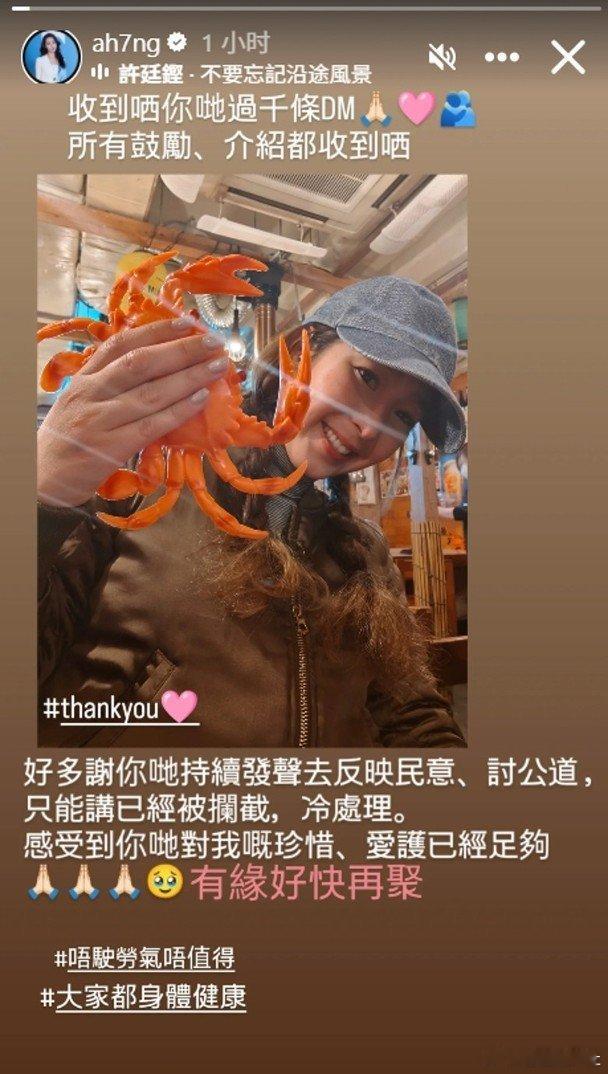 對此她透露當時突然被人事部告知終止合約,追問原因下對方卻回應「唔需要答你」,只告知「主管唔滿意表現」,冠以「莫須有」罪名,故她估計疑似因「樹大招風」,且不迎合辦公室文化而受到某種對待。今日她再於社交網限時動態發文,多謝粉絲支持並為她抱不平,但無奈大家為她發聲的結果不盡如人意:「收到晒你哋過千條DM,所有鼓勵、介紹都收到晒,好多謝你哋持續發聲去反映民意、討公道,只能講已經被攔截、冷處理,感受到你哋對我嘅珍惜、愛護已經足夠,有緣好快再聚。」