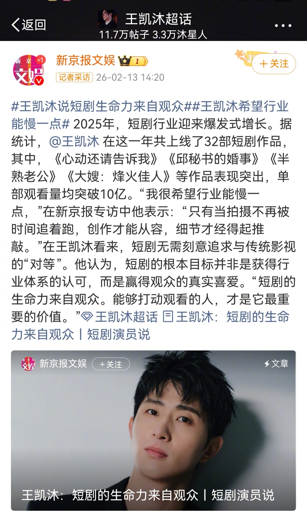 王凯沐说短剧生命力来自观众王凯沐希望行业能慢一点 好难得在一个男演员身上看到不刻意藏拙的「真」!! 王凯沐的「真」才是最打动人的,很多人把真诚当人设,他身上的只是实实在在的真!采访里问他新年愿望,结果他只说“希望自己比去年更好”,顿了一下又补了句“想从容一点”。在风口上狂奔两年还敢说“从容”,不是不想拼,是知道作品终究要靠细节撑。这种人设写进剧本都怕太假,他却在生活里演成了真的。王凯沐这样的演员的未来值得期待!
