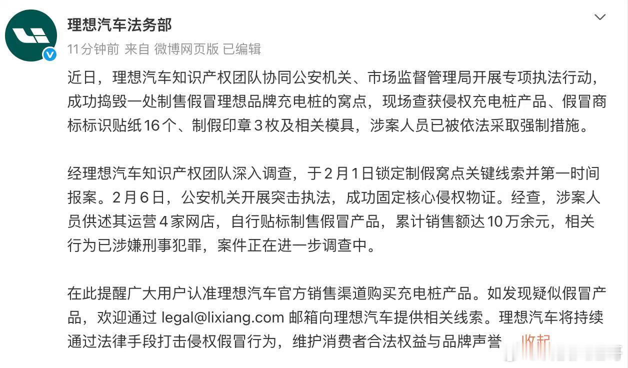 理想汽车法务部最近干了件漂亮事。他们跟警方和市场监督管理局联手,直接杀到了一个造假充电桩的窝点,查获了一堆假货、假商标还有模具,把人都抓了。他们是2月1号发现线索就立马报案,6号就突击端掉了,效率真高。这帮造假的开着4家网店,自己贴标卖,销售额有10多万,已经够判刑了。