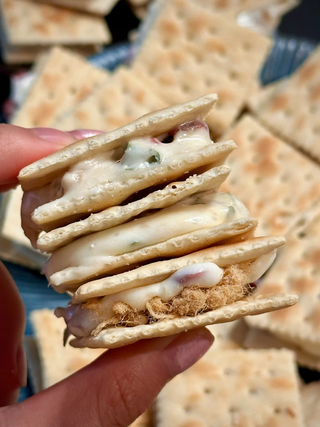 奶味浓郁的牛轧糖搭配微咸香酥的苏打饼干,中间还夹杂着蔓越莓果粒和肉松,每一口咬下都是享受。