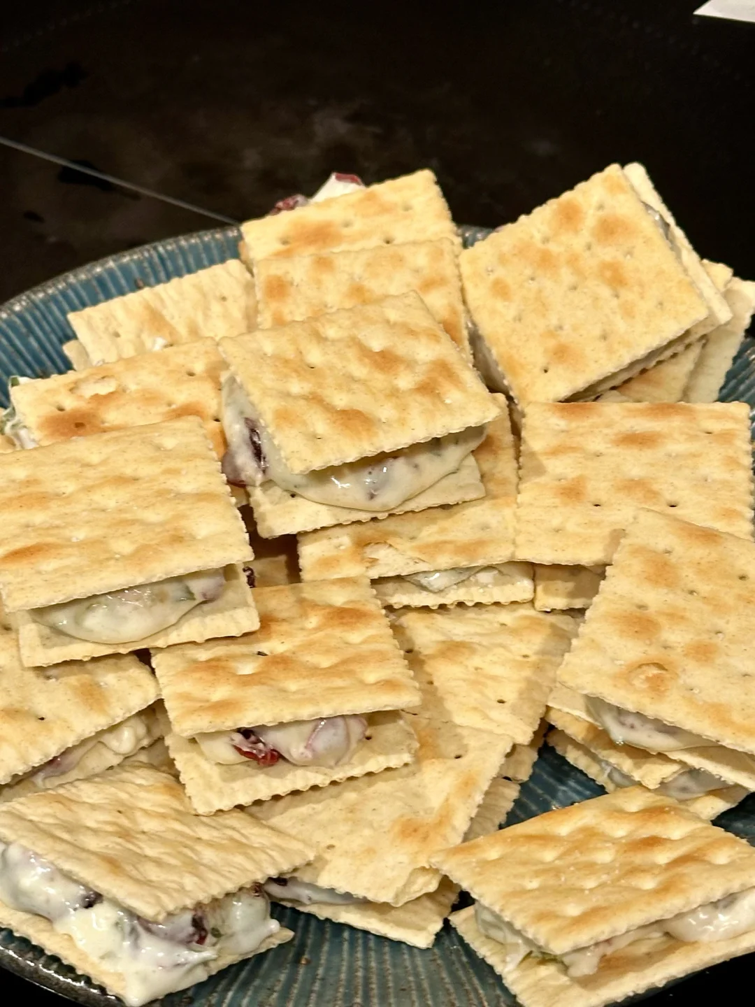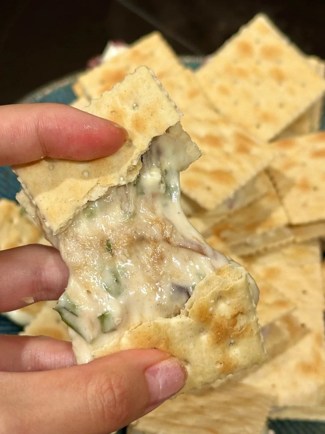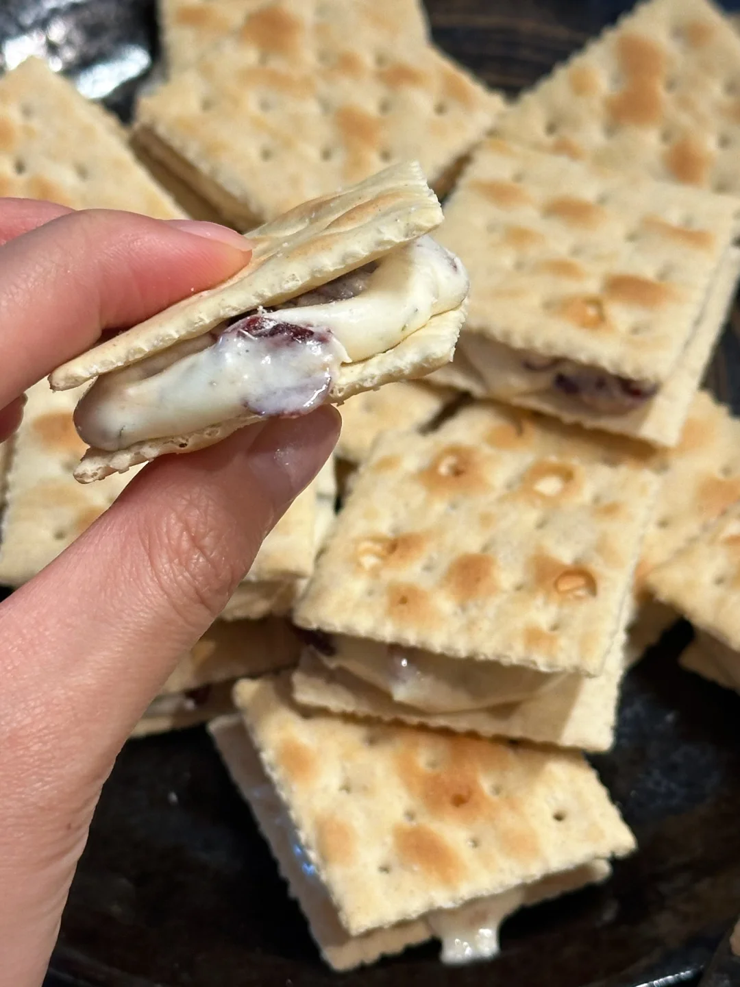 趁热用勺子舀上一勺牛轧糖,放在苏打饼干上,再用另一块苏打饼干盖上;