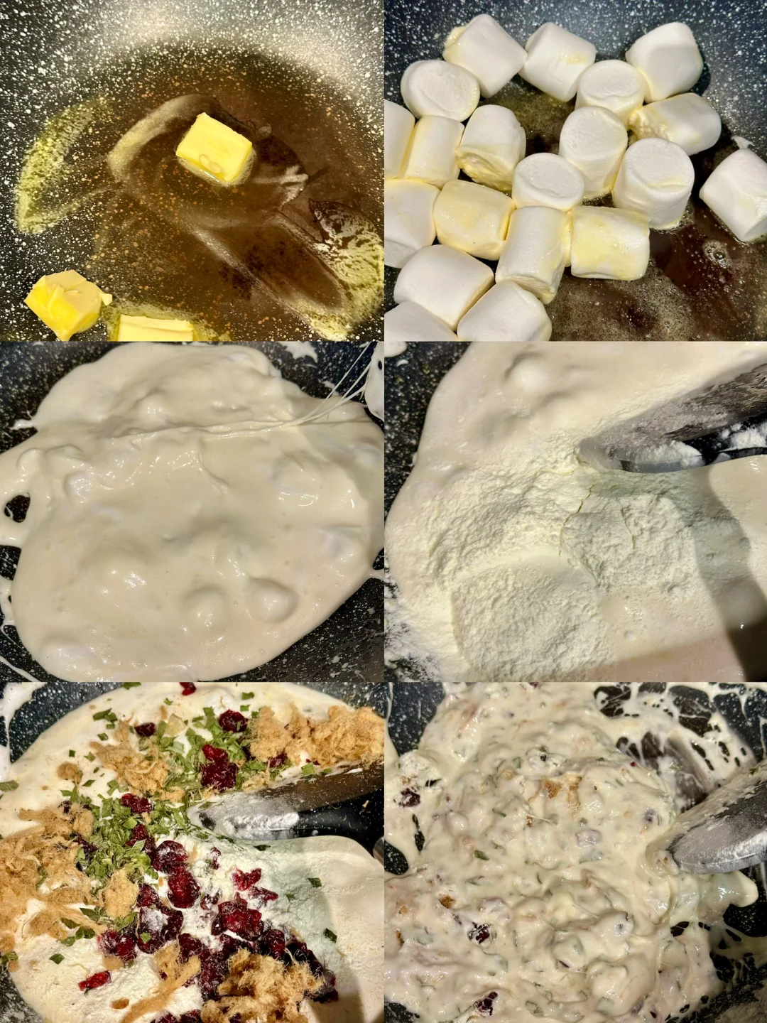 放入棉花糖,继续小火翻炒,到完全融化;