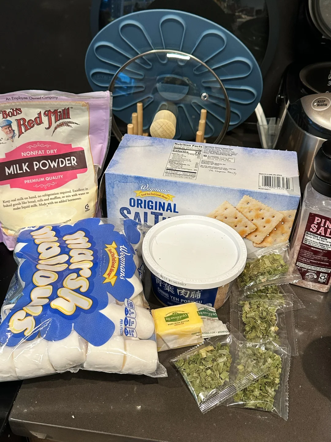 棉花糖150g(常规半袋),奶粉35g,黄油30g,saltine cracker苏打饼干一袋