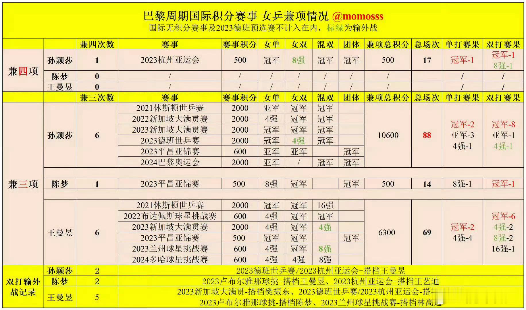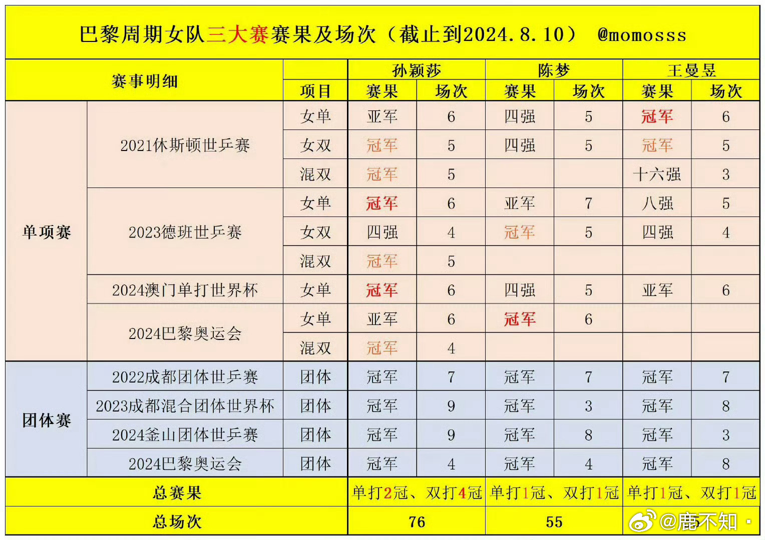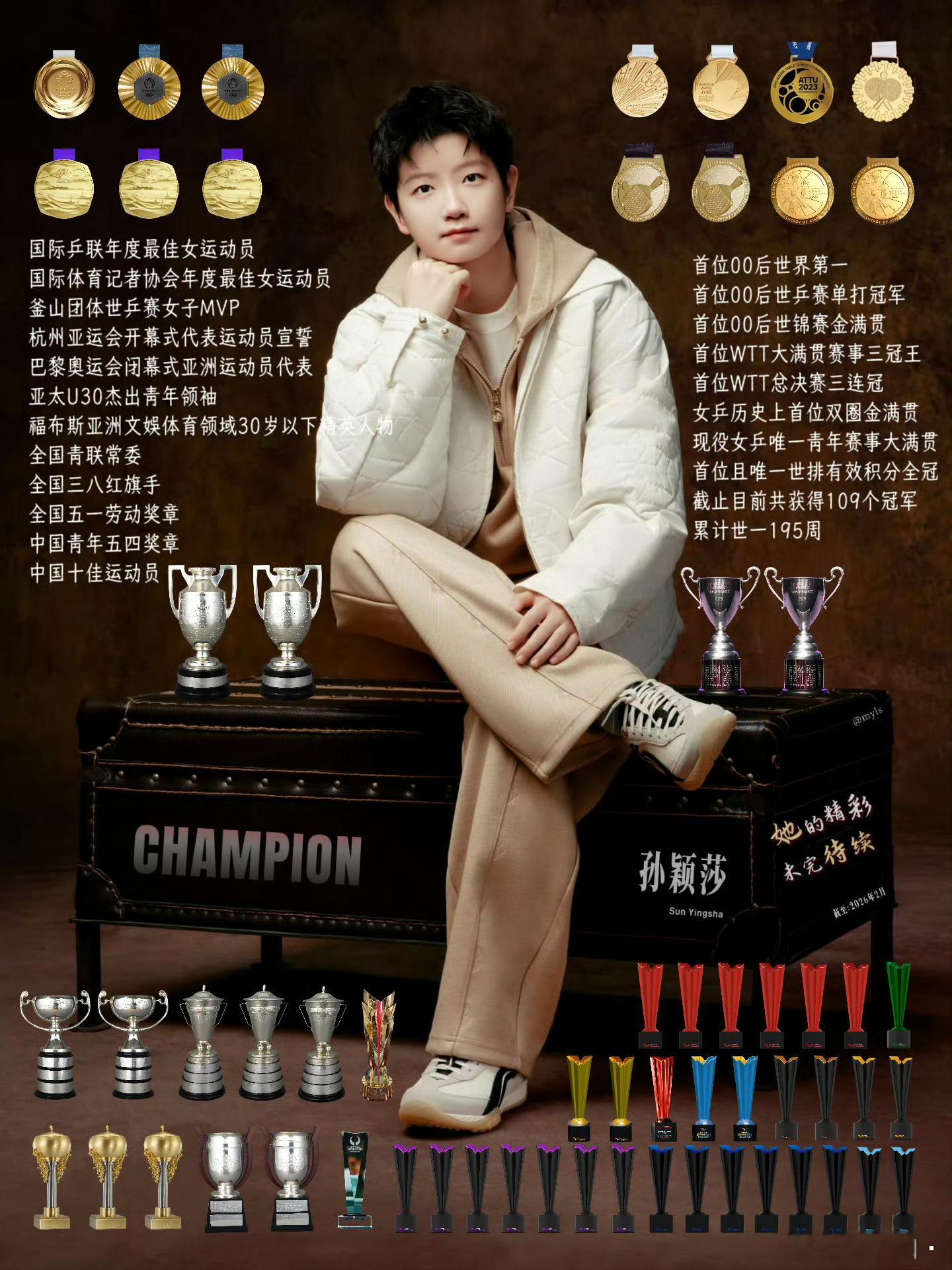 世乒赛冠军将直接获得复刻奖杯国乒女队里,巴黎周期全部三大赛唯一全部兼三的绝对主力是孙颖莎,巴黎周期唯一兼四的绝对主力是孙颖莎,巴黎奥运会唯一从开幕打到闭幕全有项目都打进决赛的是孙颖莎。 稀少的资源和耀眼的成绩不相匹配是孙颖莎长期面临的客观困境。孙颖莎两届奥运单打守半区(零封包括时任最强外协在内的所有外协对手),巴黎奥运兼三项且外战全胜,夺得国乒混双首金,两届奥运共获三金。同时也是现役唯一世锦双圈金满贯,世界杯和世锦赛女单卫冕冠军,单打和双打能力都顶尖。应该落实能专心辅导孙颖莎的主管教练,而不是继续让她和其他主力“共用”同一个教练。应该保证孙颖莎的体能康复稳定跟赛、陪练打法适配质量在线,而不是次次靠她自己硬扛。应该平等分配兼项任务杜绝弃双保单,而不是过度消耗责任心和能力都很强的孙颖莎。
