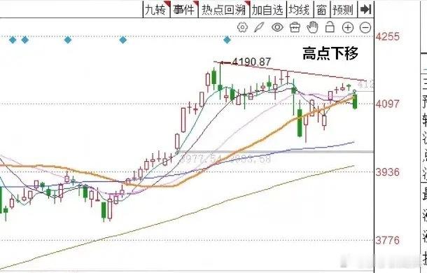 第一,最近市场高点出现了明显的高点下移的走势,我们看到市场最近的最高点是4190点,次高点4170点,然后最近的高点是前天的高点4142点大家看图一。三个高点依次出现了下移的特征。这种高点下移的特征,证明短线市场走势趋弱。