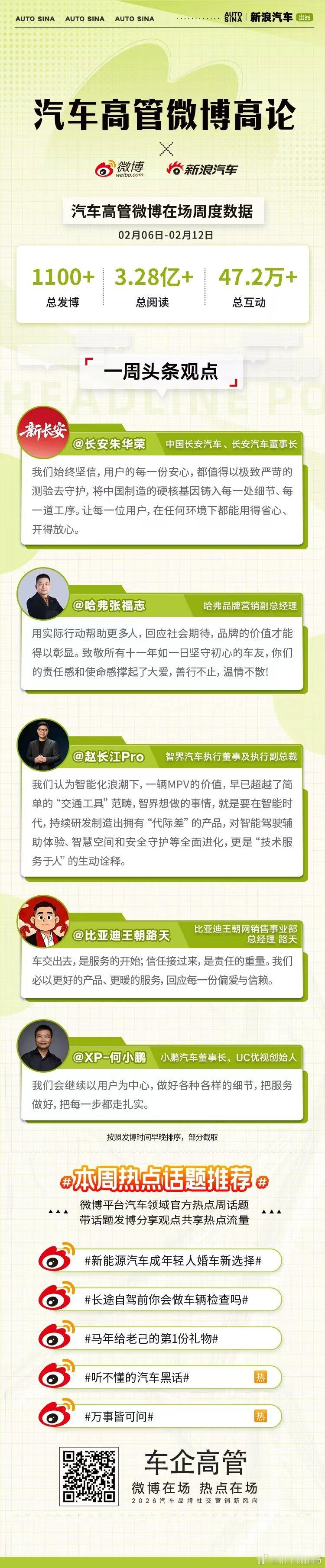 将智能技术转化为温暖体验,让汽车成为承载用户情感与信任的同行伙伴。汽车高管微博高论,省流速览微博一周高管精彩观点!