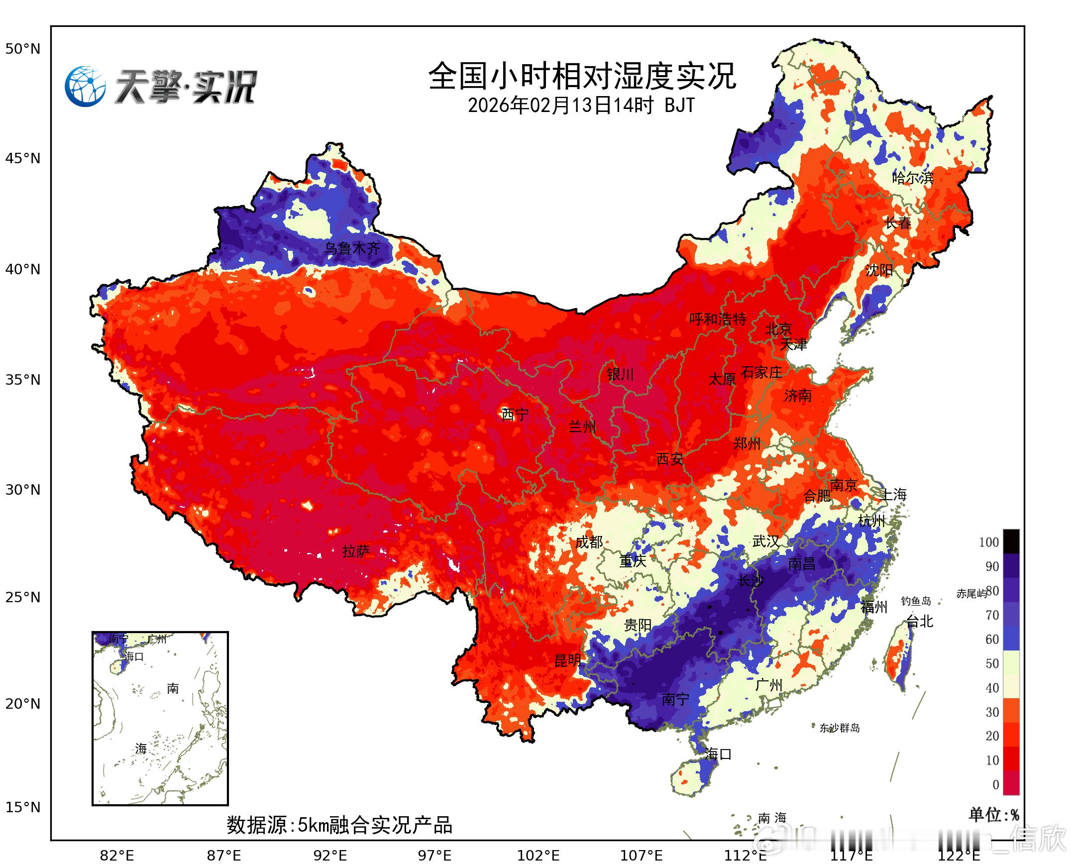 【降水和干燥】今天白天,我国降水不多,主要集中在广西湖南江西一带,衡阳县降水量10.8毫米,排名第一。这一带今天下午湿度大,地级市中,湖南衡阳、株洲、江西萍乡,相对湿度100%达到了饱和。而高原地区以及西北多地,湿度不足10%。比如甘肃武威5%、宁夏吴忠7%、陕西延安9%。