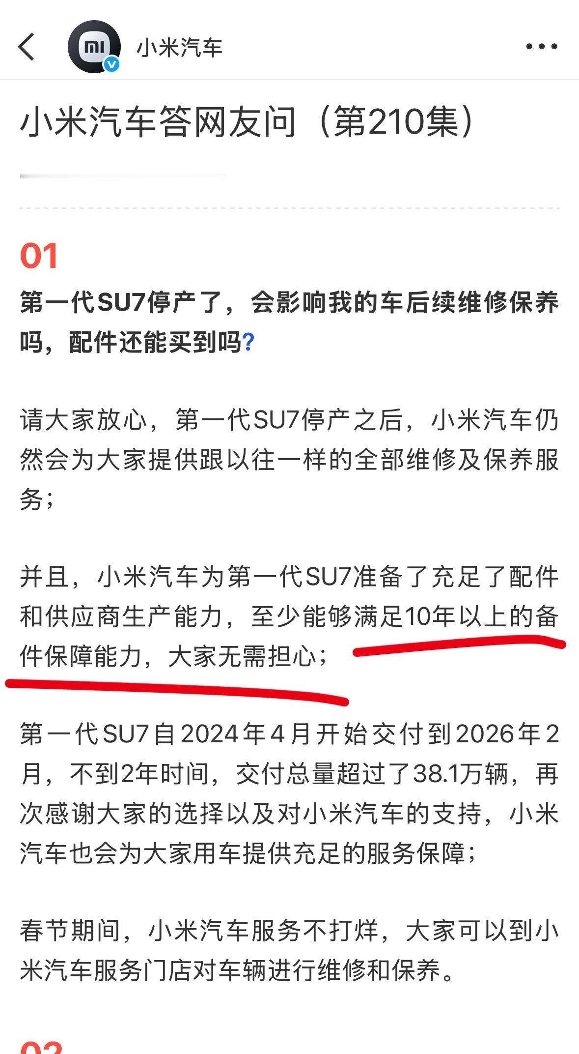 小米为停产车型备足了至少10年的备件保障!这tm是真正的玩长期的车企!新能源汽车最担忧的就是换代快,停产车型怕没配件,但是小米每一个都完美解决了!