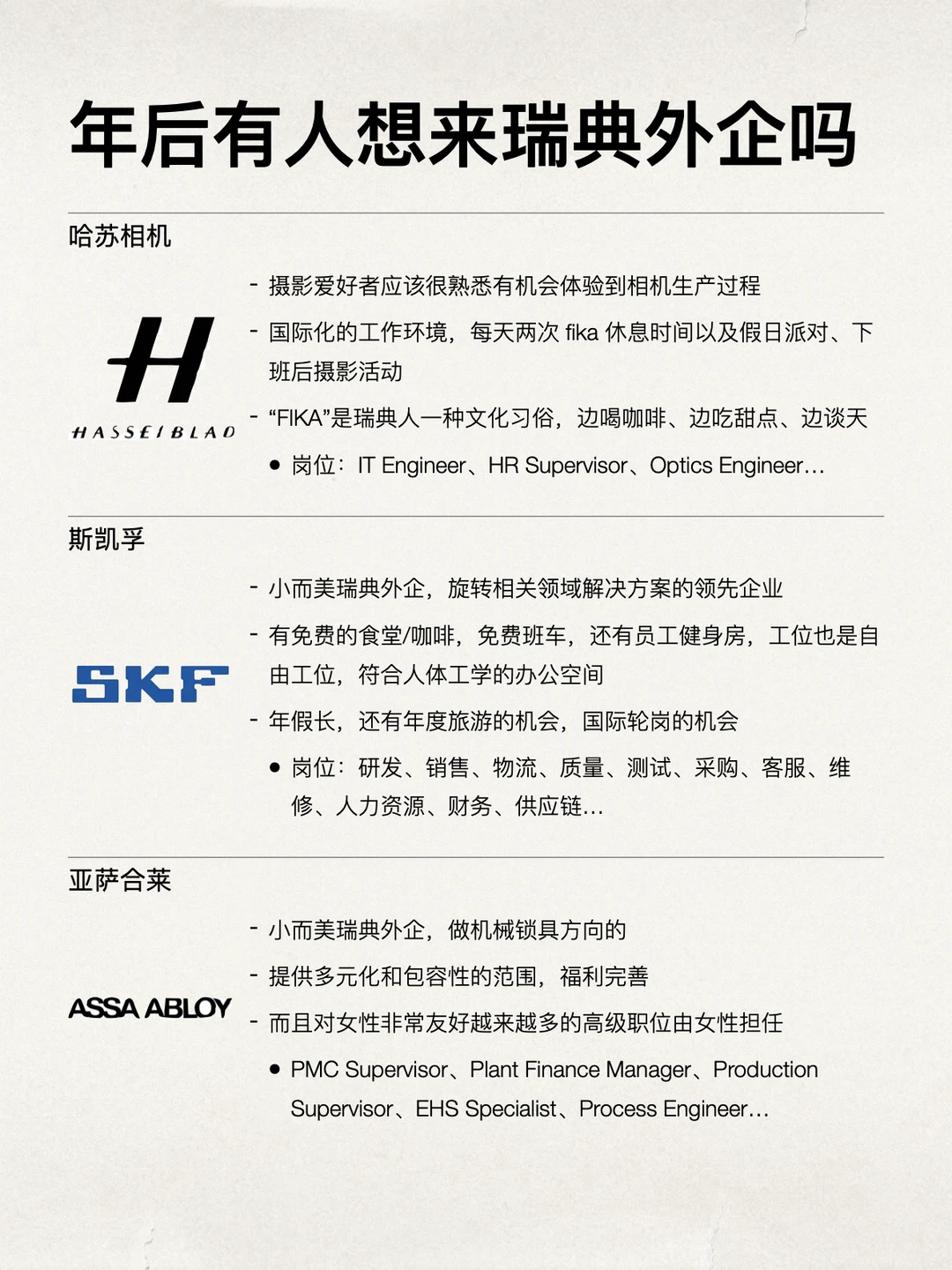 瑞典外企一直有个标签就是幸福感高。他们很强调员工体验,工作只是生活的一部分,不鼓励过度加班 很多公司实行弹性制,年假 15 天起、家庭友好政策、远程办公都很常见,下班后的时间也是属于自己的,属于长期待很舒服的类型 行业像家居、快消、工业设备这些都有,体系成熟又稳定,图上就整理了几家比较典型的 坚持日更✊🏻,对外企感兴趣的欢迎常来看看