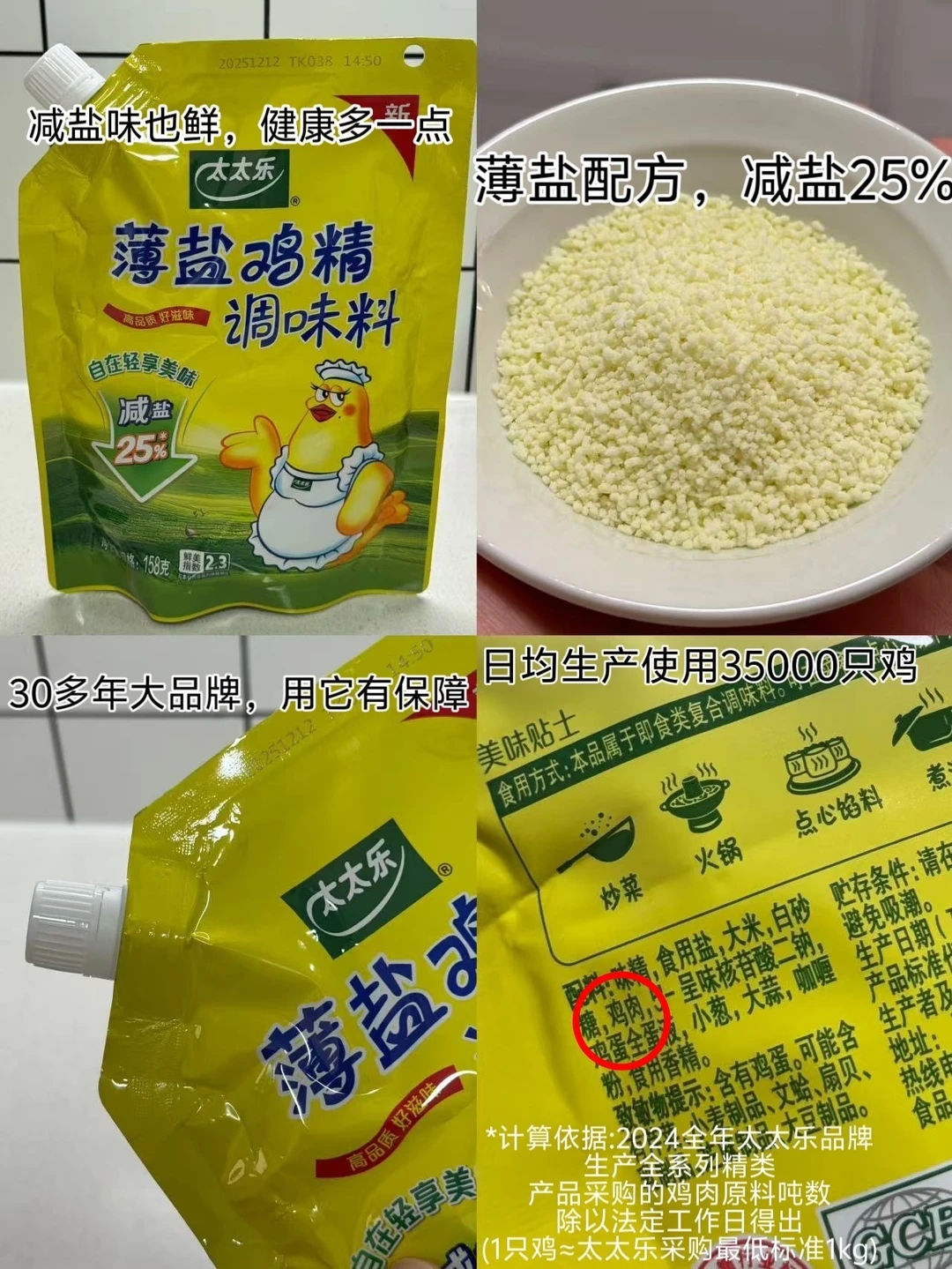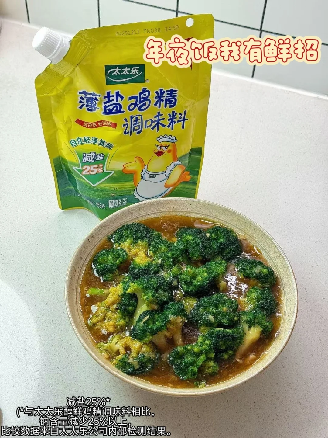 37年国民大品牌的太太乐,太懂年夜饭的烹饪需求:严选优质鸡肉入料,鲜味儿天然醇厚,没有多余添加更安心;薄盐配方比普通鸡精减盐25%,轻负担更健康,全家老小都能放心吃;天然锁鲜工艺牢牢锁住食材本味,鲜度层层递进,既能提香又不抢味,让西兰花的清甜与鲜味完美融合。贴心的加嘴设计,取料方便还干净卫生,一勺就能让素菜焕发鲜灵滋味,成为年夜饭桌上的清爽亮点。