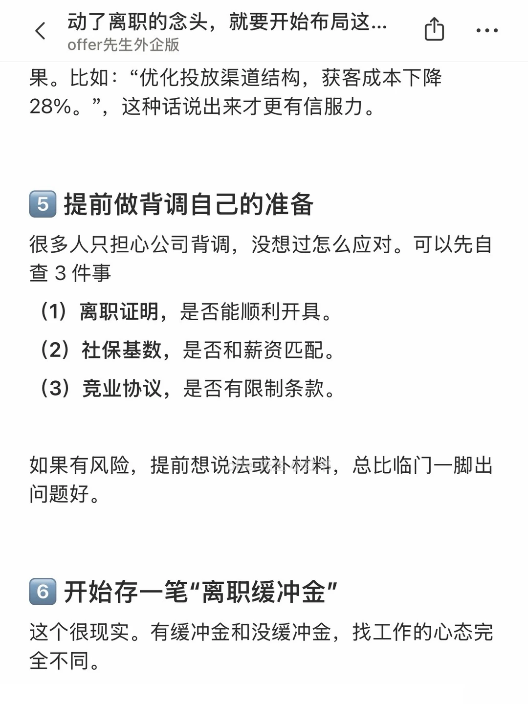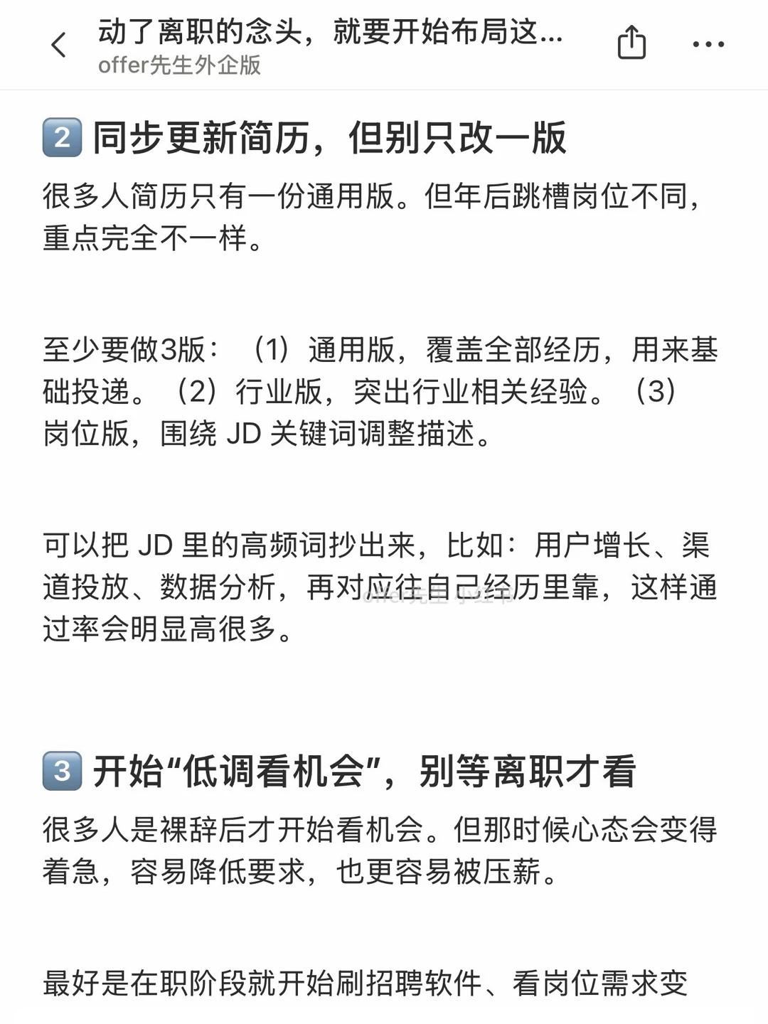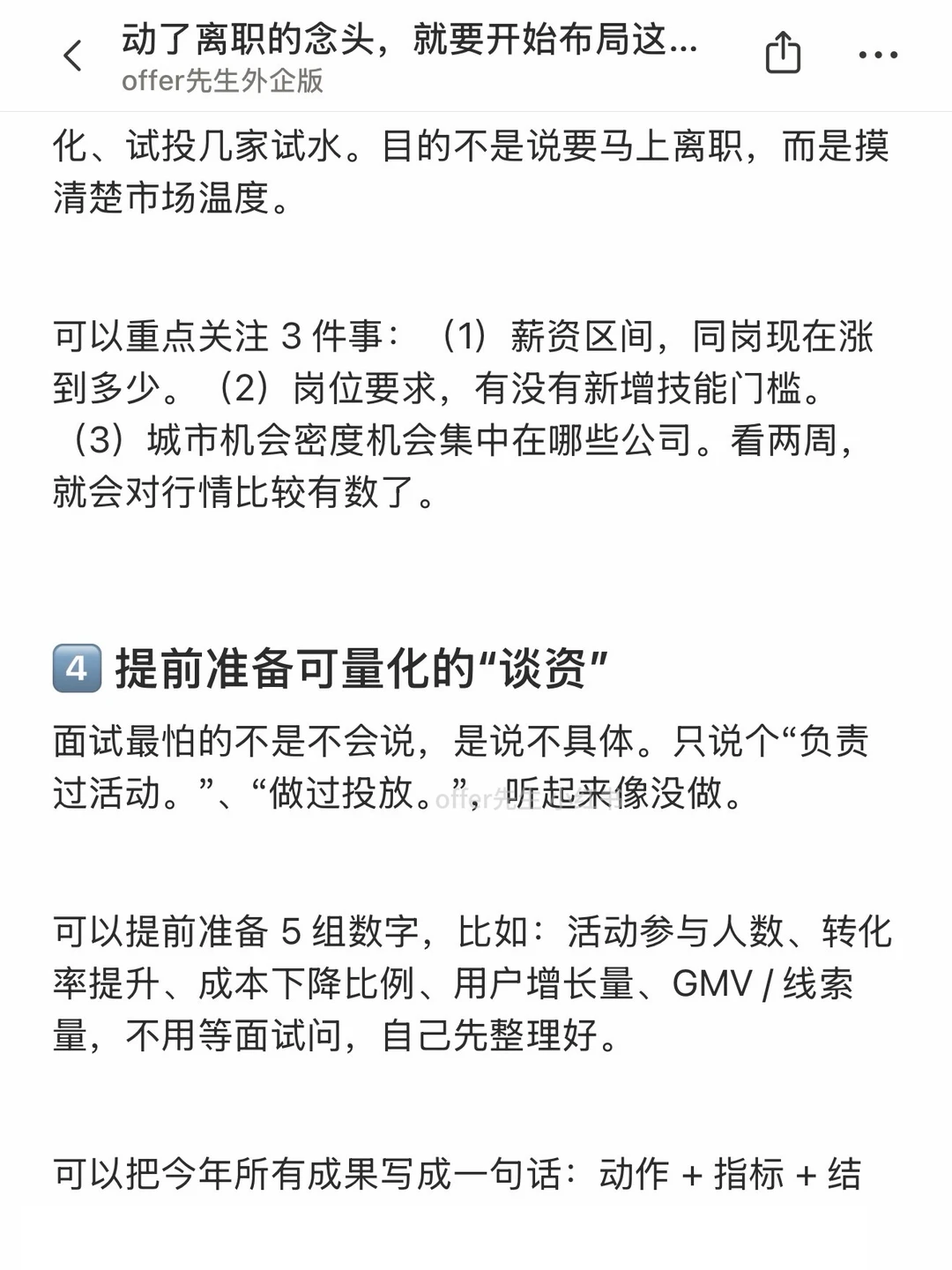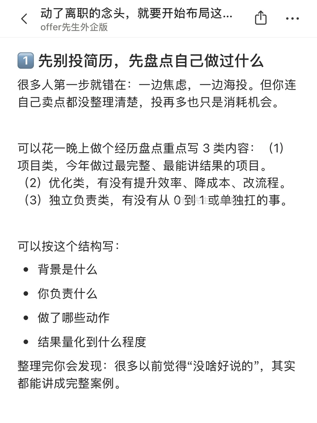 马上要过年了,可能很多人都开始动离职的念头了,想说的是,这时候一定要开始布局一些事情了。 如果不做一些准备,就很容易走到一个局面:简历是旧的、项目经历没整理、市场行情不清楚、面试一问就卡壳,最后不是没面试,就是随便接了个差不多的。 其实只要动了离职念头,哪怕还没决定走,都可以提前做一轮“静默布局”。不会影响现在工作,但会让你随时有退路。 一个认真分享“找工作”干货的账号。真诚、有料、不说空话,只想用真实经历、具体方法,帮大家少走点弯路 .