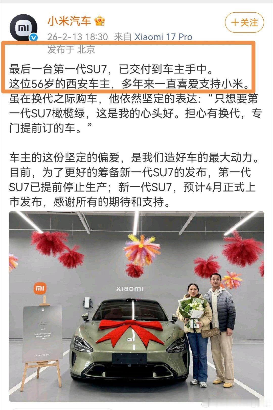最后一台一代SU7,是一位56岁车主。换普通人的话,肯定直接等新SU7