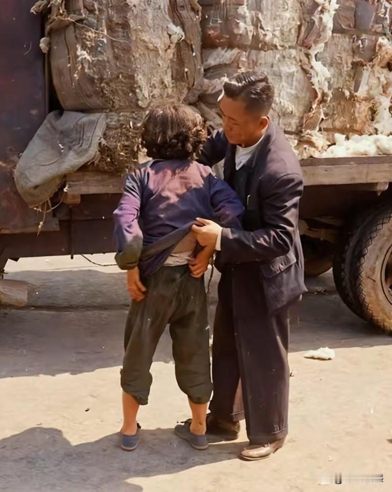 这是一张老照片,照片反映的内容是一个男子在搜身,必搜身的人是一个女子,旁边停着一辆拉棉花的车,由此可以让人推断,也许这个男子是这车棉花的主人,或者是看守这车棉花的人,他也许怀疑这个女子偷了棉花,所以对这个人进行了搜身。那时候老百姓的日子过得很穷苦,有的人也许买不起棉花,看到这台停放的棉花车,就想顺手牵羊拿点,结果被人家发现了,于是就遭受了这样的待遇!