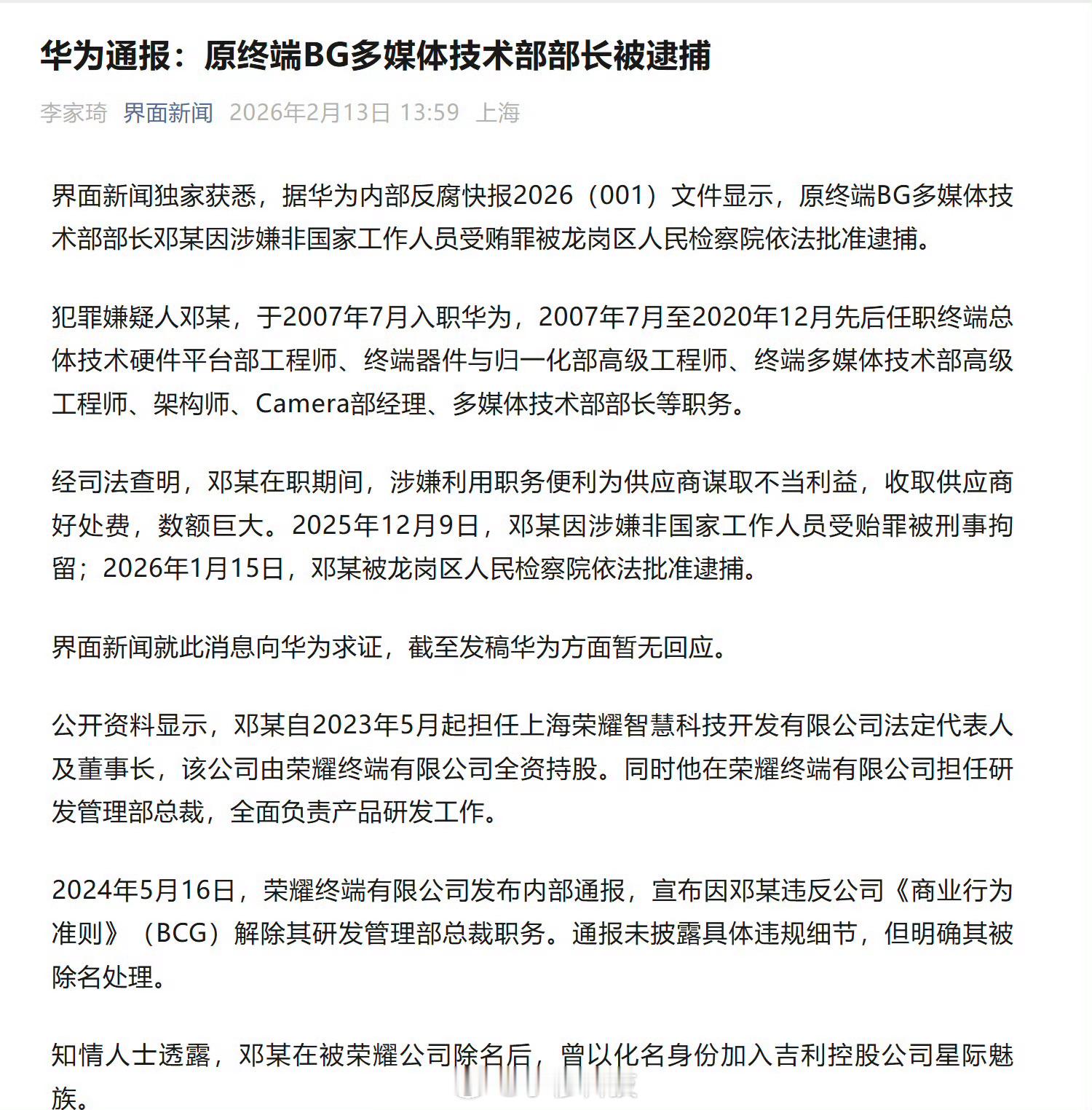 华为内部反腐通报华为内部反腐:内部通报于2007年加入华为的BG多媒体技术部部长,原荣耀研发管理部总裁邓斌涉嫌非国家工作人员受贿罪被依法逮捕,数额巨大,此前邓斌就因为BCG问题被荣耀公司除名,这个厉害了,不知道腾总是不是也是这个原因华为内部反腐通报