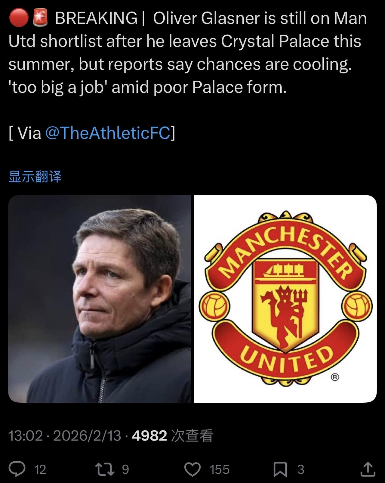 老老实实找个好教练,格拉斯纳?算了吧! ……………………………………………………………… 突发新闻 | 奥利弗·格拉斯纳今夏离开水晶宫后,仍在曼联的引援名单上,但有报道称,他加盟曼联的可能性正在降低。由于水晶宫战绩不佳,他认为格拉斯纳接手曼联“难度太大”。