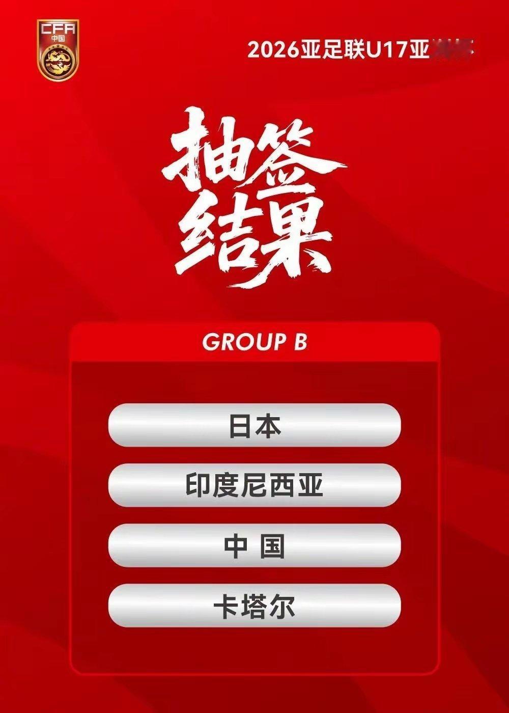 北京时间2月12日,2026亚足联U17亚洲杯抽签结果正式出炉:中国U-17男足与日本、印度尼西亚、卡塔尔同分在B组。