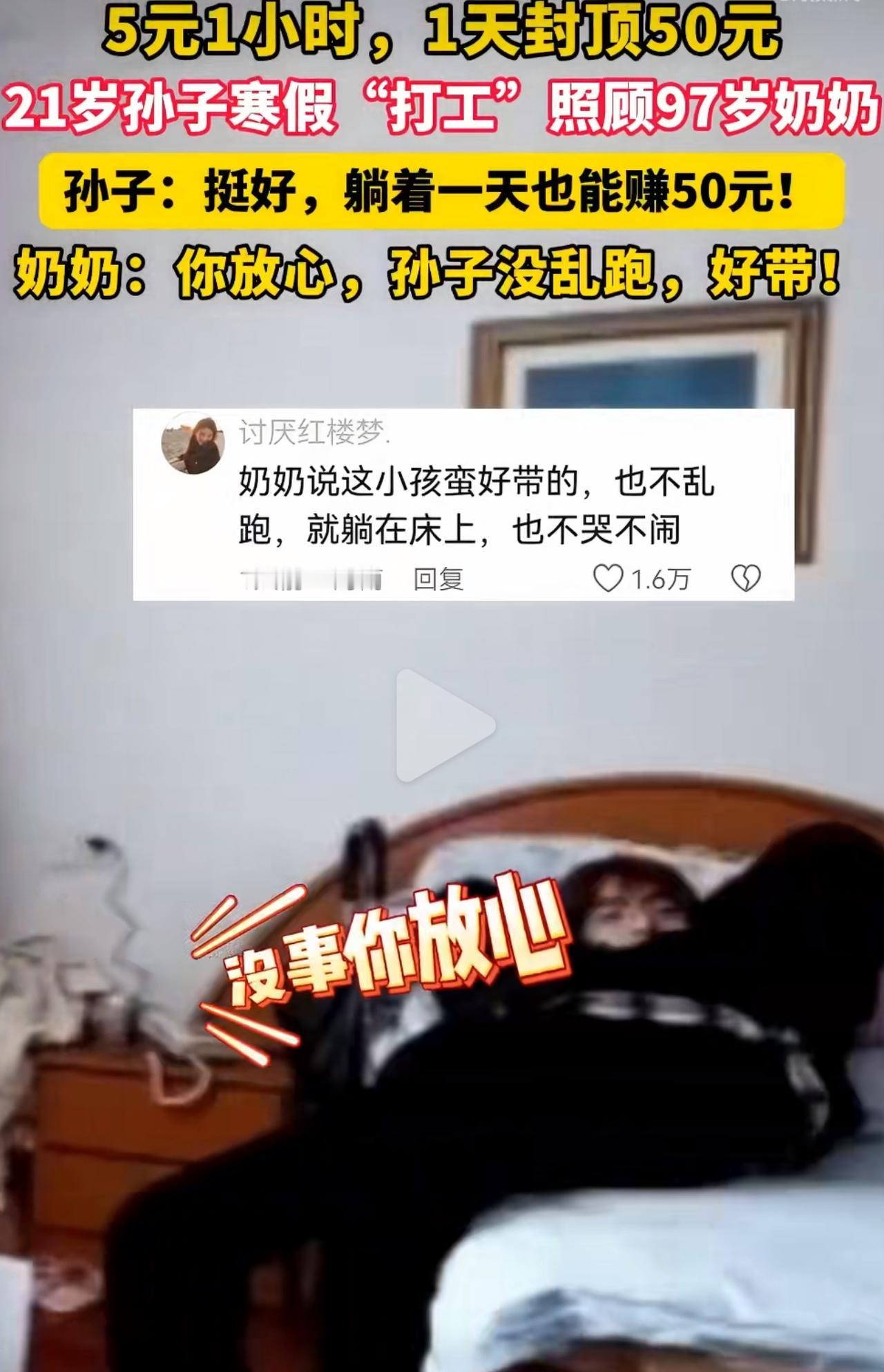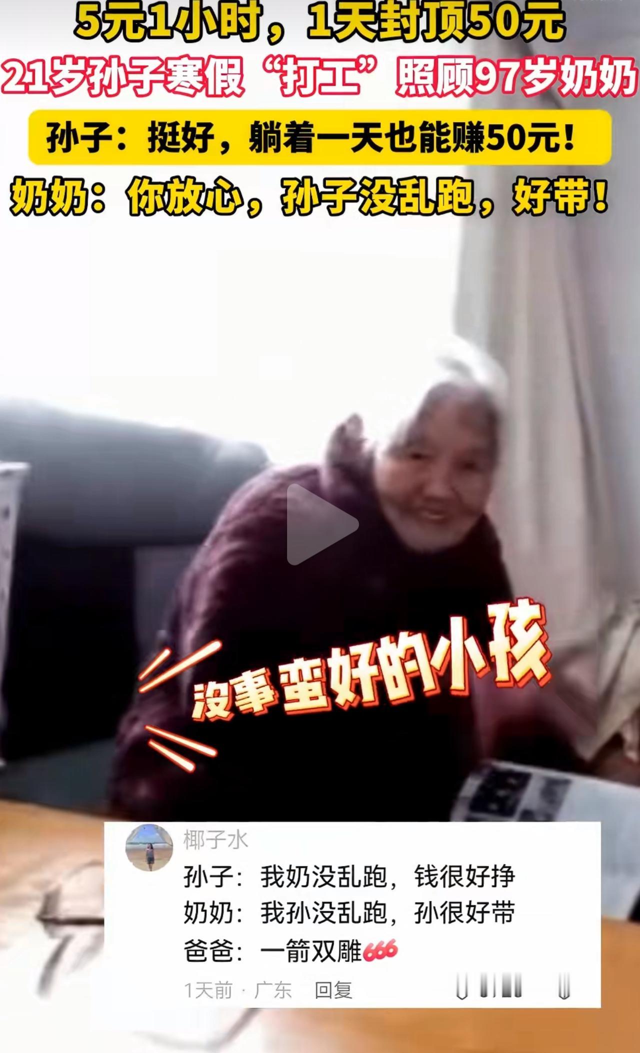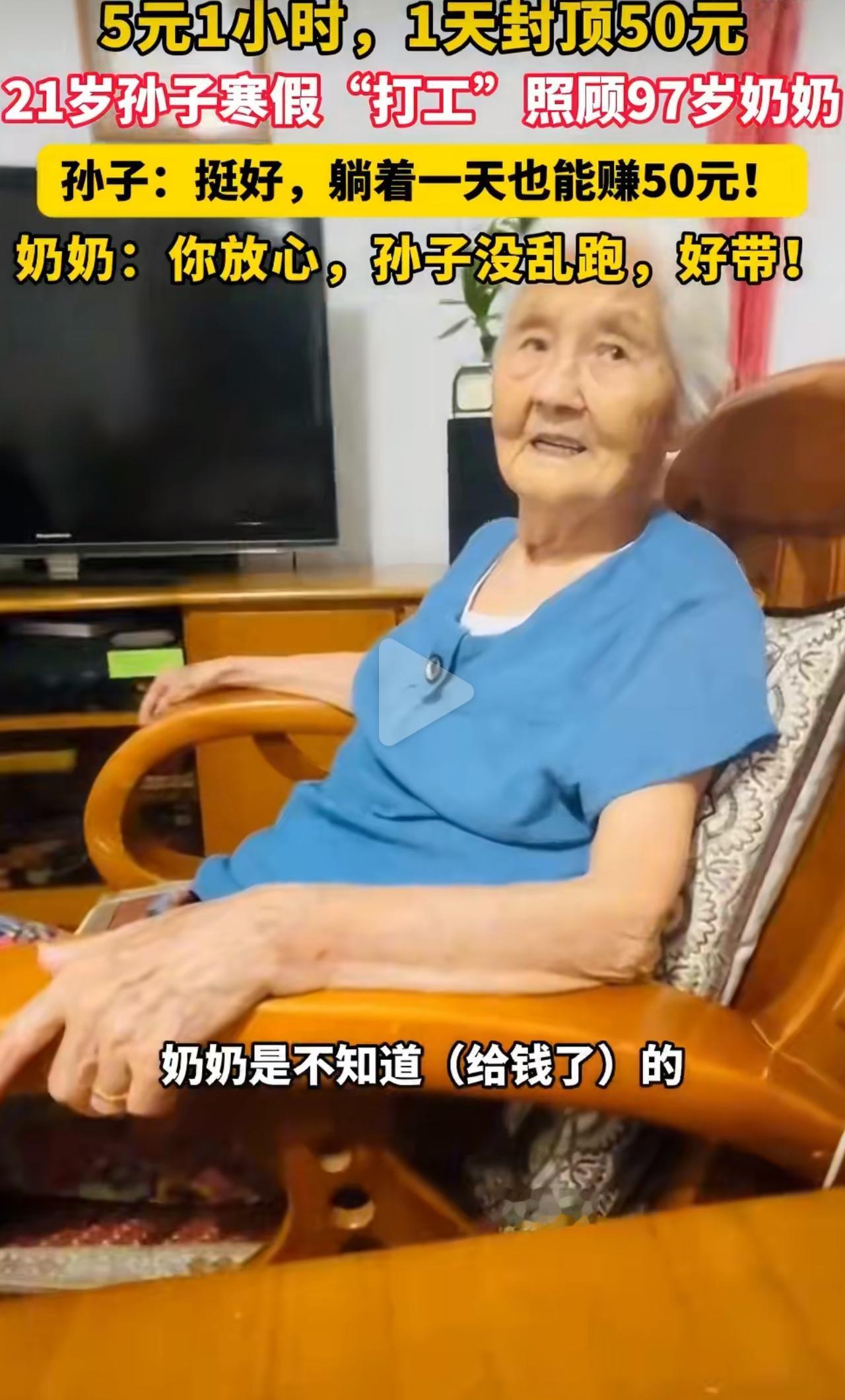 浙江宁波,这名21岁的大学生寒假在家,就接了个挺有意思的差事——5块钱一小时,一天最多挣50块,任务就是陪着97岁的奶奶吃吃饭、照看着点就行。刚开始他就想着应付应付,心里还嘀咕,陪老人能有多麻烦,肯定轻轻松松就能把钱赚了。 真陪下来才知道,奶奶特别省心,安安静静的,不闹也不乱跑,他心里一下子就踏实了,甚至偷偷觉得这钱赚得也太容易了。奶奶看着孙子天天守在身边,不往外跑、不惹麻烦,安安稳稳陪着自己,心里又暖又踏实,打心眼儿里觉得这孙子真好带。 这相差76岁的“互相带娃”,哪是什么打工啊,就是最实在的陪伴。50块钱的上限,不是钱的事,是定下了每天都要陪在身边的时间;一句简简单单的“好带”,藏着祖孙俩最朴素的温柔。不用费心费力照顾,只要安安稳稳陪着;没有跨不过去的代沟,只有你懂我、我疼你。学生暑期打工 假期工勤工俭学 最暖隔代亲